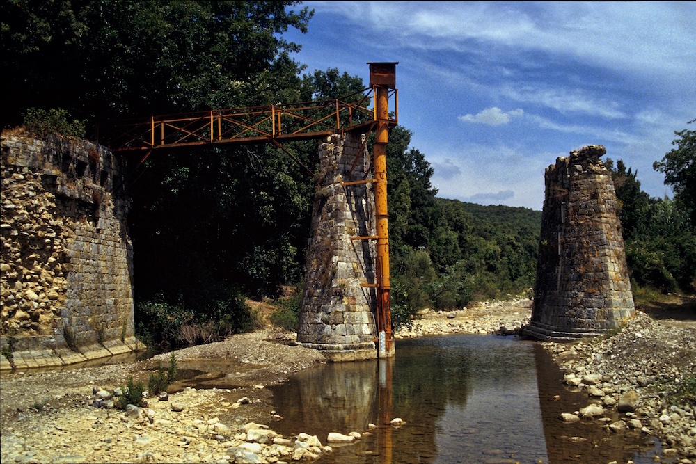 Quasi al termine del rettifilo, un centinaio di metri prima del Podere Sant’Andrea (km 18.5, alt. 65), si lascia la rotabile per una sterrata (non segnalata) che scende, verso sinistra, al letto del torrente Milia. Qui si incontrano i poderosi avanzi di un ponte in muratura e ciottoli, in origine a tre archi, utilizzato dalla ferrovia per scavalcare il corso d’acqua. In questo punto i carrelli, carichi di carbone, provenienti dalle miniere e spinti dalla forza di gravità finivano la loro corsa e venivano agganciati ai cavalli per la restante parte del tragitto. Si passa a guado il torrente e si prosegue, sempre sulla dismessa sede, risalendo il fondovalle del Milia, fra campi e lembi di bosco di querce e lecci. Spesso il tracciato è alto su un terrapieno: si notano anche residui tratti del selciato e, di nuovo, vari ponti, cui si passa accanto a guado.