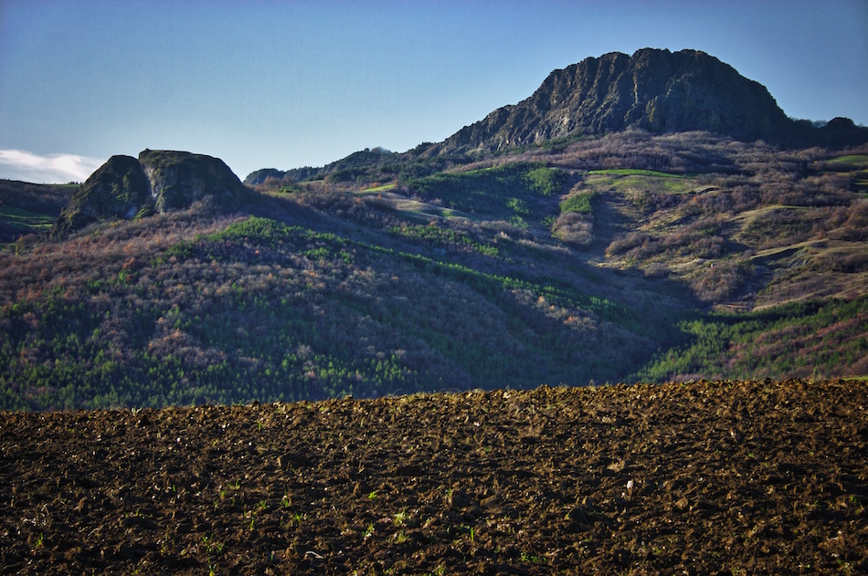 La Pietra Parcellara è uno di quei capricci geologici che movimentano la monotonia dell’Appennino. In questo senso è simile alla Pietra di Bismantova, alle penne di San Leo e San Marino, ai Sassi di Rocca Malatina. È una cuspide scabra e repulsiva che affiora da un’armonia di colline verdi e intensamente lavorate. Sembra quasi estromessa con violenza dalle profondità del pianeta. Gli esperti chiamano ofiolite la sua scura roccia. Il termine viene dal greco ‘ophis’, serpente, per via della somiglianza alla pelle di un rettile e al colore scuro. Sono in effetti rocce che sono sgorgate dal magma che scuoteva gli strati interni del pianeta 150 milioni di anni fa.