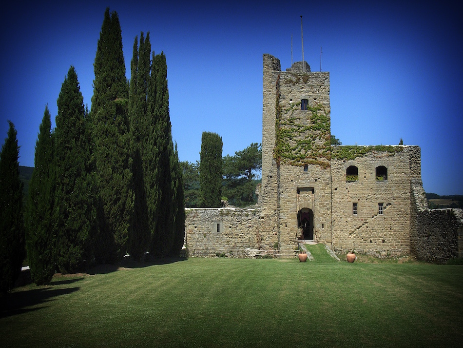 Sazi di queste piccole ‘perle’ di cultura generale si può ora impegnare il segnavia ‘bianco-rosso 26’ che marcherà per buon tratto il percorso. Si passa l’Arno – qui poco più di un torrentello – a margine dell’abitato e si costeggia la strada provinciale 74 ‘di Scarpaccia’. Al primo tornante la si abbandona approfittando della vecchia sterrata. Questa sale e raggiunge Case Palaia per poi confluire di nuovo nella provinciale. Ancora pochi passi sull’asfalto: quindi si piega a sinistra, aiutati dalle indicazioni per il castello. Si calca lo sterrato di una bella stradetta di crinale, fra cipressi e scorci panoramici, ormai in vista del castello. È una delle tante ‘strade bianche’ della Toscana: delizia dei paesaggisti, maledizione dei viandanti ricoperti di fine polvere bianca dopo il passaggio di un veicolo.