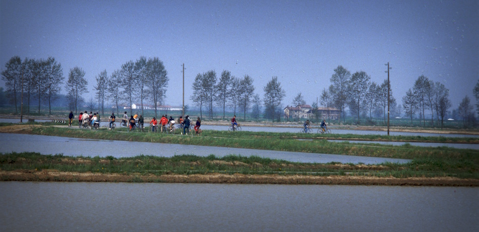 In primavera le risaie della Lomellina si coprono di un sottile velo d’acqua e il paesaggio si trasforma d’incanto. Il cielo si ribalta riflettendosi nell’acqua, le strade di campagna sono tenui fili che disegnano la geometria di un immenso lago. All’orizzonte le tremule foglie dei pioppi nascondono le vette del Monte Rosa, sempre coperte di neve, bassi cascinali sostengono enormi tettoie in coppi che giungono quasi a rasentare il suolo, dai fossi s’invola un airone, lo ‘sgulgiòn’ come si chiama da queste parti. Ogni ‘camera’ – ovvero lo spazio di una risaia – è divisa dall’altra da arginelli di terra e nessuna sta alla stessa quota di un’altra, così da consentire il lento fluire dell’acqua. I germogli di riso stanno in immersione per oltre un mese per difendersi dagli sbalzi di temperatura e dar vita alle pianticelle che arriveranno a maturazione a fine estate. Si tratta di un paesaggio unico in Italia e davvero attraente specie se lo si percorre in bicicletta, stando sospesi fra acqua e cielo.