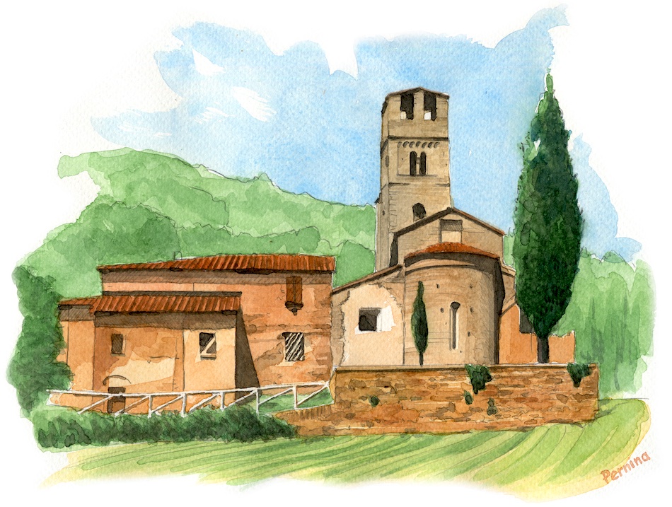Si lascia l’asfalto e passando per i Poderi Taverna e Bareto ci si avvia verso il borgo La Cetina (segnavia 110). Lo si può raggiungere oppure deviare prima, verso sinistra e continuare nell’alternanza di poderi con i loro campicelli a terrazzi e le dense fustaie dei lecci. Dopo il Podere Gabbreta, in rovina, la traccia si riduce a sentiero e spunta nella bella radura di Pernina, dalle cui case emerge la struttura e l’alta torre della pieve romanica di S. Maria, oggi però intitolata a S.Giovanni Battista (vedi l’immagine di copertina). Risale al XII secolo, ha una pianta a tre navate, capitelli lavorati e un’ampia abside.