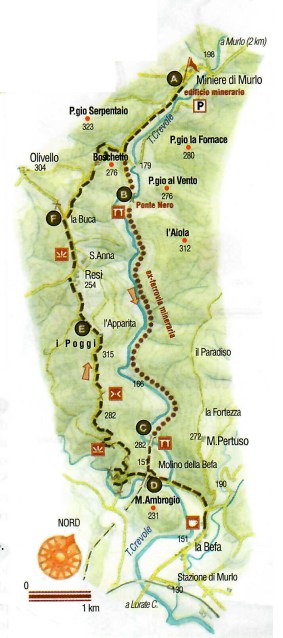Partenza e arrivo: Miniere di Murlo, frazione di Murlo a 2 km dal capoluogo. Murlo si raggiunge in auto seguendo da Siena (km 28) la statale 2 ‘Cassia’, fino a Lucignano; quindi la direzione segnalata.Dove mangiare: a la Befa, Trattoria da Brunello, 0577.806255. Dove dormire: Bed&Breakfast Campeccioli, Casciano di Murlo, 347.3469605, www.poderecampeccioli.it