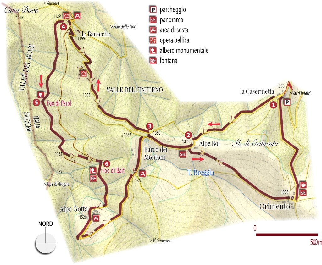 Il confine con la Svizzera passa poco sotto il sentiero, ma non segue il fondovalle. Traccia una teorica linea retta nel bosco che diede luogo, in passato, a non poche dispute. Nel XVII secolo però, gli intelvesi giurarono solennemente, pena i più terribili castighi divini, che il confine passava proprio di lì, non prima e non dopo. Una volta tanto i diffidenti Svizzeri li presero in parola.