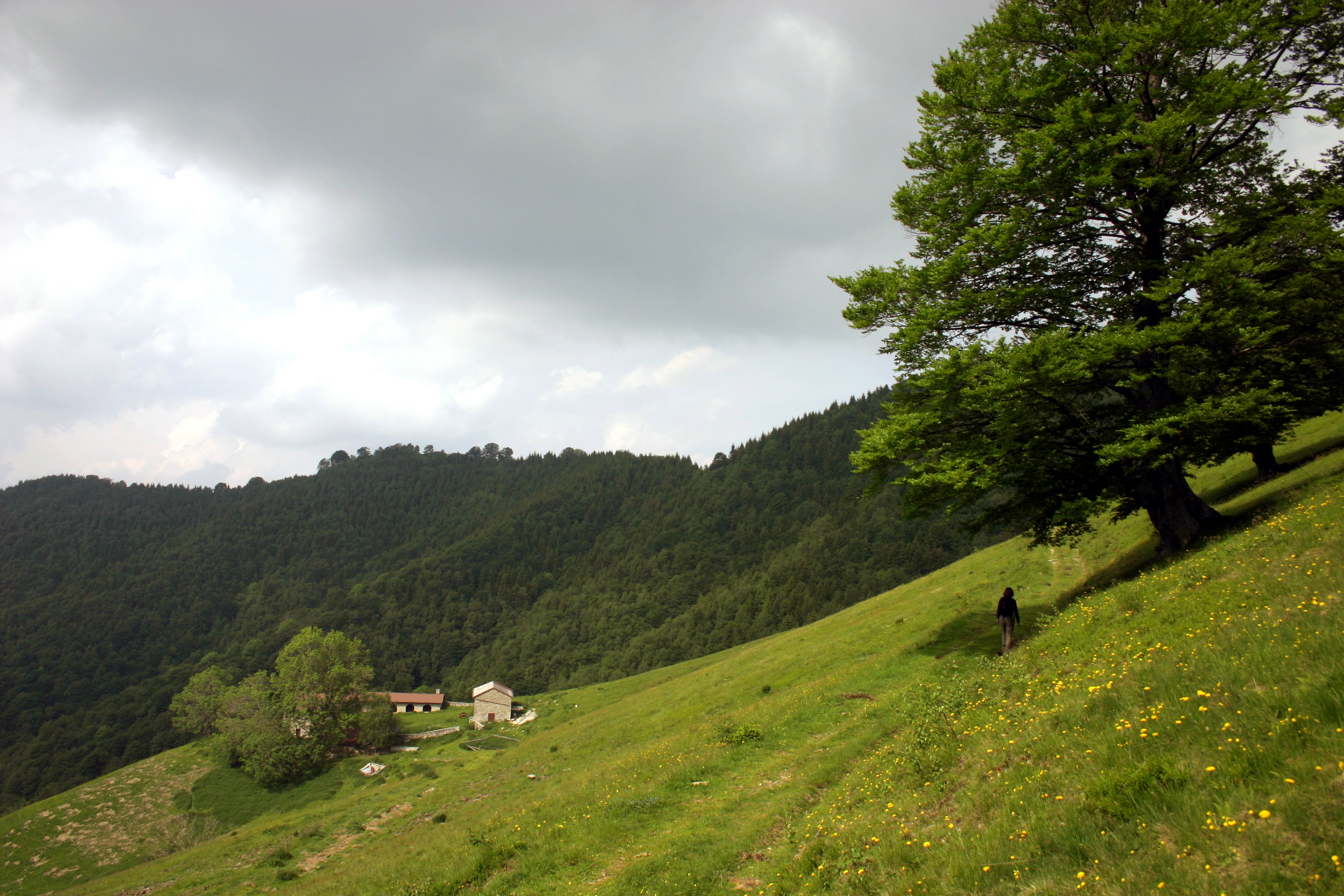 Dalla Casermetta (alt. 1256) 1 s’imbocca lo stradello indicato per il M. Generoso. Dopo breve tratto si guadagna l’Alpe Bol (alt. 1328) 2 che affaccia sull’alta valle della Breggia. Ora il percorso spiana fra prati, cespugli e betulle. Poco dopo si raggiunge la conca del Barco dei Montoni (alt. 1352) 3, dov’è una ‘bolla’ per l’abbeveraggio del bestiame. Da questa conca nasce il fiume Breggia: entra in Svizzera a Erbonne formando la Valle di Muggio, e sfocia nel lago di Como, presso Cernobbio, nuovamente in territorio italiano. Passando accanto a una bacheca (direzione Le Baracche) si scollina e, verso sinistra, ci si incammina su una pista forestale (segnavia 21) che scende il versante del Sasso Bovè. Siamo all’interno della foresta demaniale del Monte Generoso, estesa per circa 233 ettari nel comune di Pellio Intelvi. La valle che si scorge sulla destra ha il nome, poco invitante, di Valle dell’Inferno, e con quella al di là del costone alla nostra sinistra, costituisce il cuore della foresta, o meglio, della faggeta, dall’albero che meglio la contraddistingue.