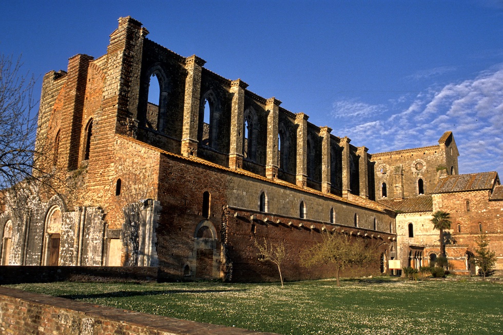 bosco e alla collina. Sulla destra, oltre la cortina di alberi che nasconde il Fiume Merse, sembrano incombere le rovine dell’abbazia di San Galgano. Ad esse si può accedere con una breve deviazione segnalata, una volta giunti presso un piazzaletto con una panchina (km 15.6, alt. 275): deviando a sinistra si scende al Merse che fino a qualche anno fa si poteva attraversare su un pittoresco ponticello in legno, ora crollato. Comunque, se il livello dell’acqua consente un passaggio a guado, una volta sull’altra sponda, attraversando un vasto campo rispettando le segnalazioni si arriva al piazzale della celebre abbazia. Volendo rifocillarsi si può arrivare al Bar della Fattoria in fondo al primo viale alberato. L’abbazia sorge in splendida solitudine, guardata dall’alto dall’eremo di Montesiepi. Questi luoghi, oggi battuti solo dai turisti e da qualche contadino sulle sue macchine agricole, dovevano essere in passato molto più abitati e lavorati. I monaci favorivano la bonifica attraverso la regolazione e l’uso della forza idraulica per muovere le ruote dei mulini e delle gualchiere. Molti di questi impianti, oggi semidiroccati, sorgevano lungo il Fiume Merse.