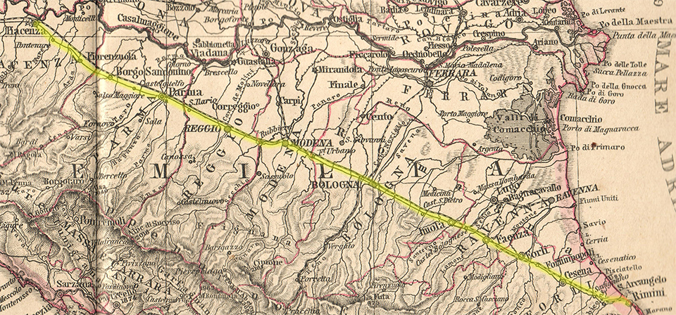 La Via Emilia corre diritta come un fuso per oltre 250 chilometri da Rimini a Piacenza. Qualcuno potrebbe obiettare che no, che qualche trasgressione la fa. Come quello strano saliente a Castelfranco Emilia che si spiega con il variato andamento del Panaro o come quelle lievi gobbe a Cesena causate dall’approssimarsi delle colline. Ma sono le solite eccezioni che confermano una verità.