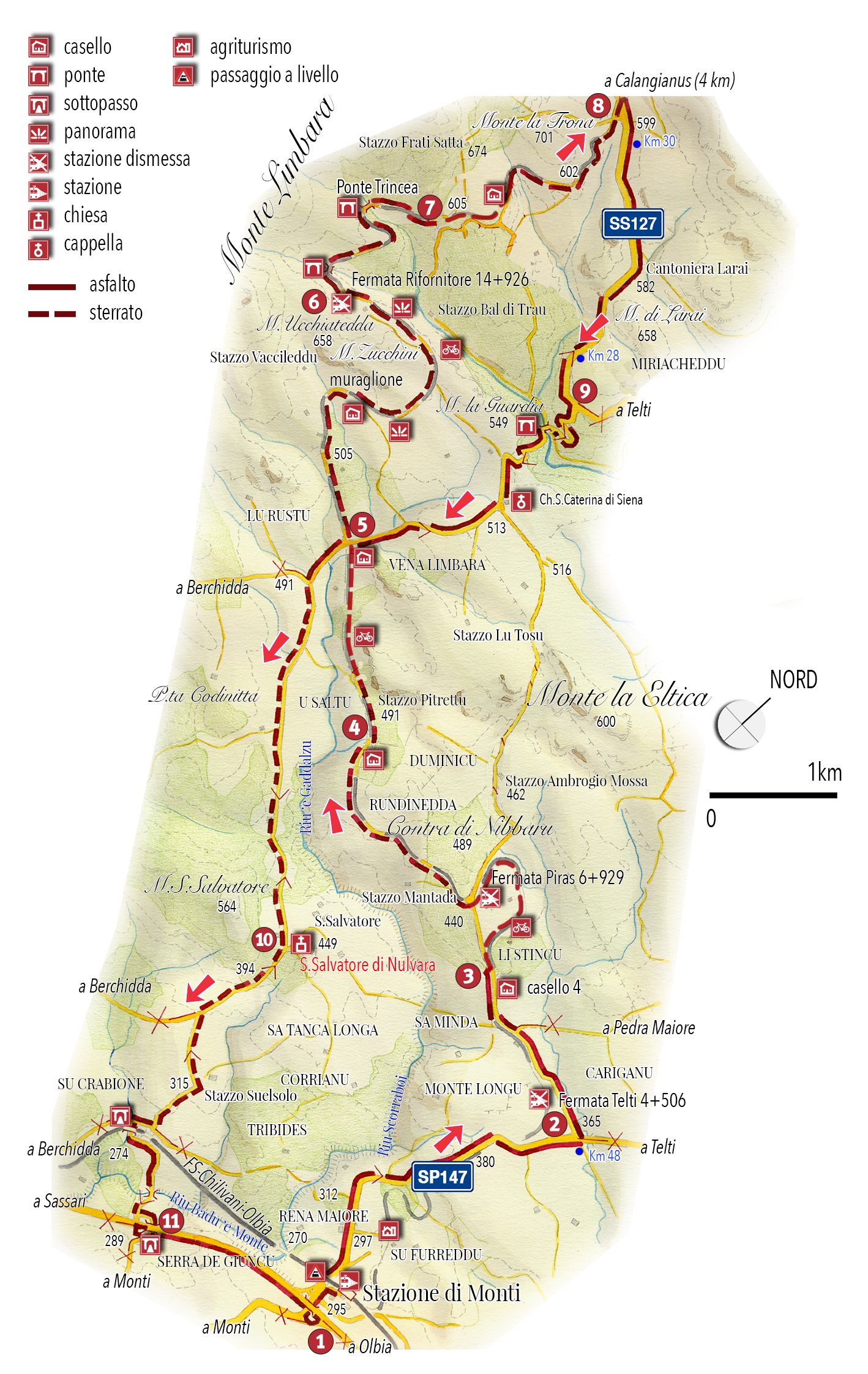 10. In tal modo si giunge vicino alla chiesa di San Salvatore di Nulvara (km 38.1, alt. 449), della quale però restano solo sparuti avanzi. La strada diventa più larga e scende verso le campagne di Berchidda. Occorre fare attenzione e, a un certo punto, piegare a sinistra, per raggiungere più rapidamente la stazione di Monti. Si sottopassa la ferrovia e dopo un brusco strappo in salita si incontra la superstrada per Olbia (km 41.9, alt. 260). Occorre seguirla con prudenza (un sottopasso agevola l’immissione) per circa 1500 metri fino allo svincolo nei pressi della stazione Fs dalla quale eravamo partiti.