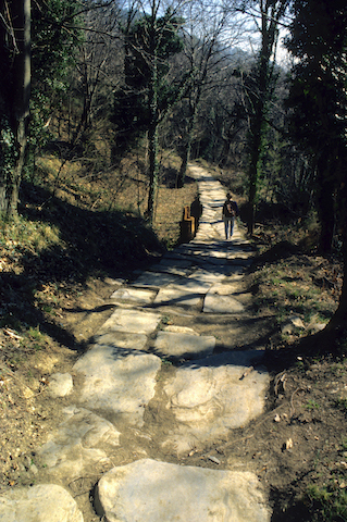 Lasciata alle spalle la chiesa s’inizia a scendere, sempre lungo la strada asfaltata. Fatti pochi passi però, una rampa in discesa, verso destra, invita a raggiungere il percorso mulattiero più antico che si snoda parallelo ma immerso nel castagneto. Si tratta di un percorso recentemente recuperato. Sembra subito di grande bellezza. Imboccandolo infatti, ci si avvede che il piano del calpestìo è fatto di enormi placche di ardesia, della dimensione anche di alcuni metri quadrati. Giustapposte le une all’altre e intervallate da bassi gradini compongono un nastro continuo, talvolta rilevato sul terreno, altre volte contenuto da lastre messe di taglio. Si notano anche, semisepolti dalla vegetazione, gli accessi a vecchie cave di ardesia.
