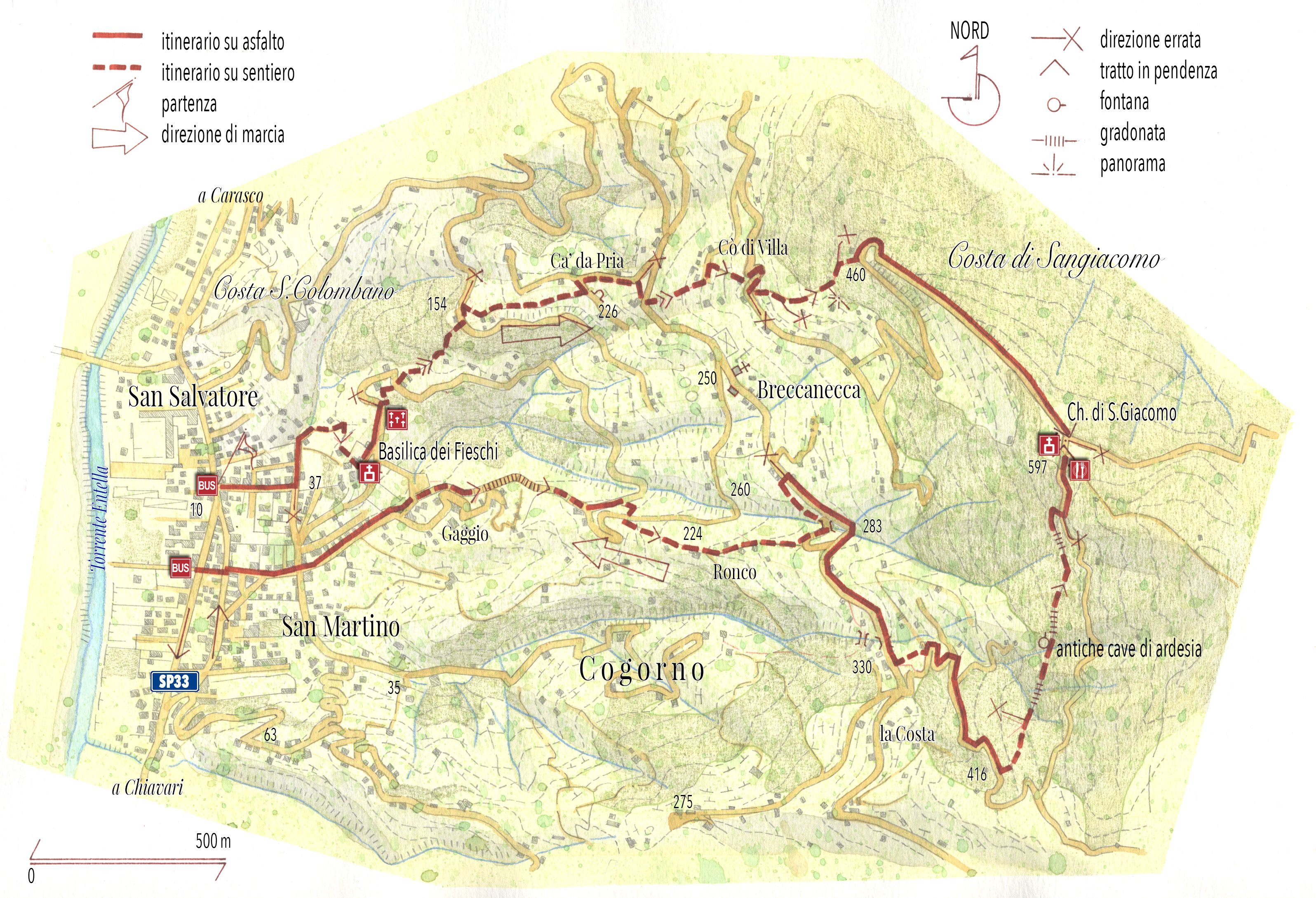 Si scende dall’autobus proveniente da Chiavari alla fermata posta poco prima del semaforo di San Salvatore (alt. 10), abitato moderno allungato sulla strada provinciale. Subito si imbocca la perpendicolare via Valparaiso; in fondo ad essa, si piega a sinistra (via della Fea) e si raggiunge il bel sentiero selciato che, fra orti e campi, sale in direzione della vicina collina dove si adagia il nucleo più vecchio dell’abitato.
