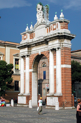 Dalla Stazione Fs di Rimini ci si dirige nel centro città; lo si attraversa puntando al Ponte di Tiberio, non senza aver dato un sguardo al celebre Tempio Malatestiano, disegnato nel 1450 da Leon Battista Alberti. L’architetto genovese ripropose lo stile degli antichi edifici della romanità con un rivestimento marmoreo – una sorta di ‘vestito umanistico’ – a un edificio che, all’interno, era nato con uno schema proprio. Nessuna concessione al gotico, purezza delle forme e anche il segno dell’incompiuto nella parte absidale, mai conclusa a causa degli alti costi e delle sopravvenute sventure politiche di Sigismondo Malatesta. Questi fu la figura più insigne della famiglia di condottieri che dalla prima metà del XIII sec. ebbe in potere Rimini, sorta di piccolo Stato nel più vasto dominio della Chiesa. Lo si vede raffigurato in ginocchio dinanzi a S.Sigismondo, notissima opera ad affresco di Piero della Francesca (1451), un ‘manifesto’ del Rinascimento, modello di costruzione spaziale, di studio della luce e dichiarazione spontanea dello splendore della figura umana nella duplice interpretazione del santo re e del devoto committente.