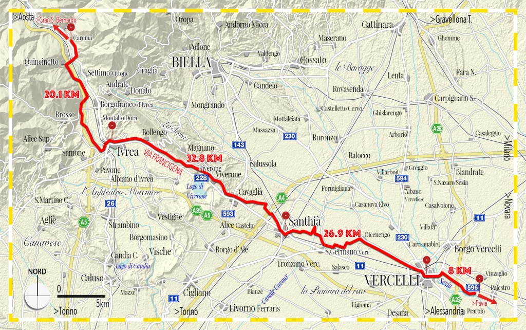 Con il nome di Francigena Canavesana e, aggiungo, Vercellese, si identifica il classico itinerario pedonale, che ripercorre la via tracciata nell’anno 990 da Sigerico, vescovo di Canterbury, di ritorno da Roma, al quale si è affiancato, negli ultimi anni, un itinerario ciclabile che da quello pedonale si differenza laddove i sentieri impediscono il passaggio di una bicicletta. Formalmente mai ufficializzato, ma studiato e segnalato da Alberto Conte con un segnavia di colore bianco-celeste, la Francigena ciclabile, oltre che itinerario di interesse nazionale, si propone anche come itinerario regionale grazie a una lunghezza totale di 85.5 km, e come snodo di altri percorsi. Va altresì detto che l’itinerario 5 ‘Via Romea Francigena’ della rete EuroVelo non corrisponde all’itinerario piemontese poiché entra in Italia dal valico di Ponte Chiasso in Lombardia.