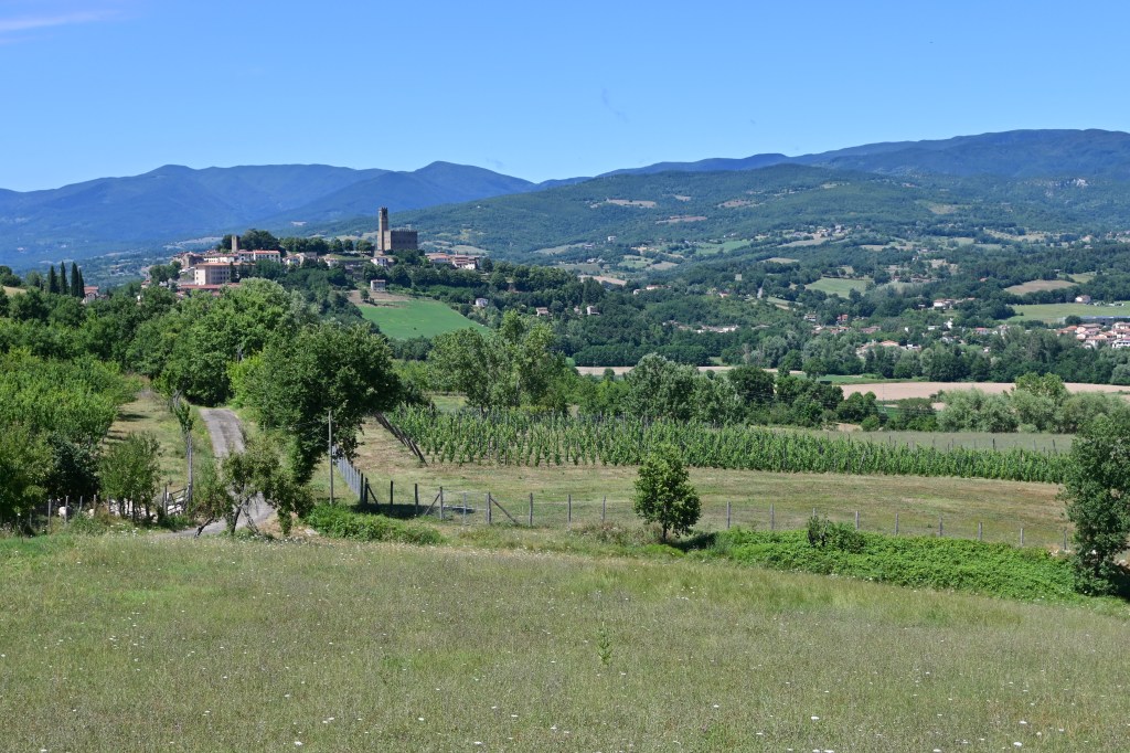 Si prosegue sul sentiero che aggira il poggio di Fronzola protendendosi sul crinale della collina, quasi sempre dentro il bosco. Si superano un paio di crocicchi mantenendo sempre la direzione mediana sul vetusto sentiero del quale si apprezzano tratti di antico selciato. Era probabilmente una delle tante mulattiere che scavalcavano il Pratomagno per raggiungere Firenze. Dopo buon tratto e una lieve salita si perviene di nuovo sull’asfalto, nel punto che archiviamo come il più elevato dell’anello, a quota 621. Ora si segue la strada carrozzabile, verso destra che ben presto apre un’incantevole veduta su Poppi e sulla vicina Larniano: un grumo di case radunate attorno alla sua chiesuola. È da qui che si gode la poesia del paesaggio. Nella valle dell’Arno, dietro l’altura di Poppi si stende la piana di Campaldino, nota per la celebre battaglia del 1289 a cui partecipò un giovane Dante Alighieri. Lontana, invece, la cornice dei monti che vanno dal Falterona alla Verna. Più vicine, le pendici sparse di boschi e di campi, fra i quali si aprono valli appena accennate e apparentemente selvatiche.