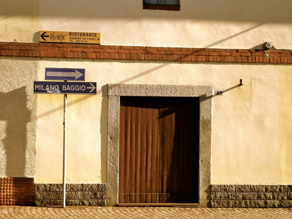 Una evidente risposta sui precari destini di questo spazi periurbani si legge subito dopo: fissate lo sguardo su un grosso fabbricato giallo, al di là della carreggiata stradale. Fu un cascinale di nome Moirano, che lo è stato ve lo dico io: oggi ospita 70 nuovi appartamenti, «in un raro esempio di equilibrio fra tradizione e modernità» dice il sito dell’immobiliare che ha curato il recupero. Dall’esterno assomiglia più a un allegro carcere, così isolato nel mezzo di una improbabile campagna. Meglio finire così o meglio lasciare tutto a marcire? Come si constata poche pedalate più avanti, passando accanto ad Assiano (km 5,5, alt. 124, 3), un enorme cascinale, o meglio un vero borgo agricolo, nel 1045 dipendenza, come Moirano, della basilica di S. Ambrogio. Oggi è in totale sfacelo. Grave è che per una vasta parte sia di patrimonio pubblico. Siamo nel Parco Agricolo Sud Milano e si imporrebbe più rispetto, sia nel fare di nuovo, sia nel conservare il vecchio. Ma lascio a voi ogni ulteriore riflessione. Chiudo queste recriminazioni con un dettaglio curioso: nella cantina di una delle cascine di Assiano sgorga il fontanile S. Martino la cui acqua a temperatura costante (10°C) veniva utilizzata in un locale apposito, per la conservazione di formaggi e insaccati.