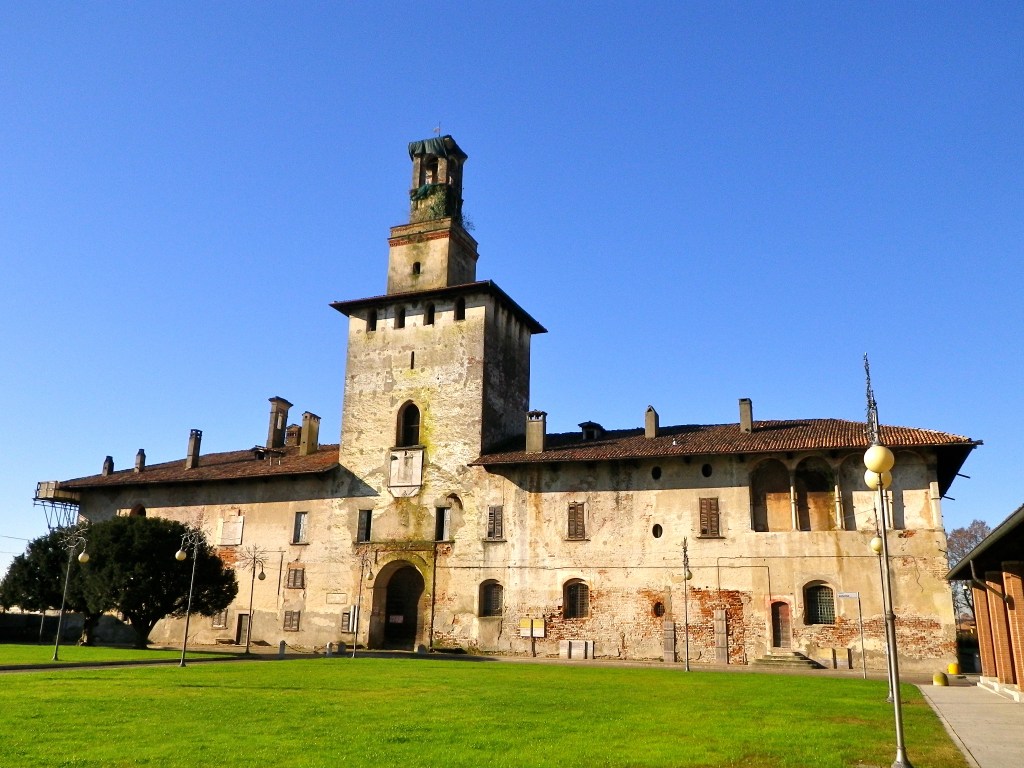 Fu costruito nella seconda metà del XIV secolo come residenza di campagna di Bernabò Visconti. Curiosamente manca di torri angolari, sostituite da una sola alta torre centrale a elementi sovrapposti, versione ‘povera’ di quella del Castello Sforzesco a Milano. Ciò è indicativo della funzione non strettamente militare del fortilizio. Filippo Maria Visconti lo collegò a Milano tramite un canale che confluiva nel Naviglio Grande nei pressi di Gaggiano. Lodovico il Moro, dopo una fase di abbandono, lo riprese nel 1480 e lo rinnovò per i fasti della villeggiatura di corte; nel 1525 fu ceduto al conte Stampa di Soncino e trasformato in azienda agricola. Oggi non se la passa benissimo e la corte interna, da qualche tempo, non è più visitabile. Non a caso è fra i ‘luoghi del cuore’ più citati e meritevoli di salvaguardia.