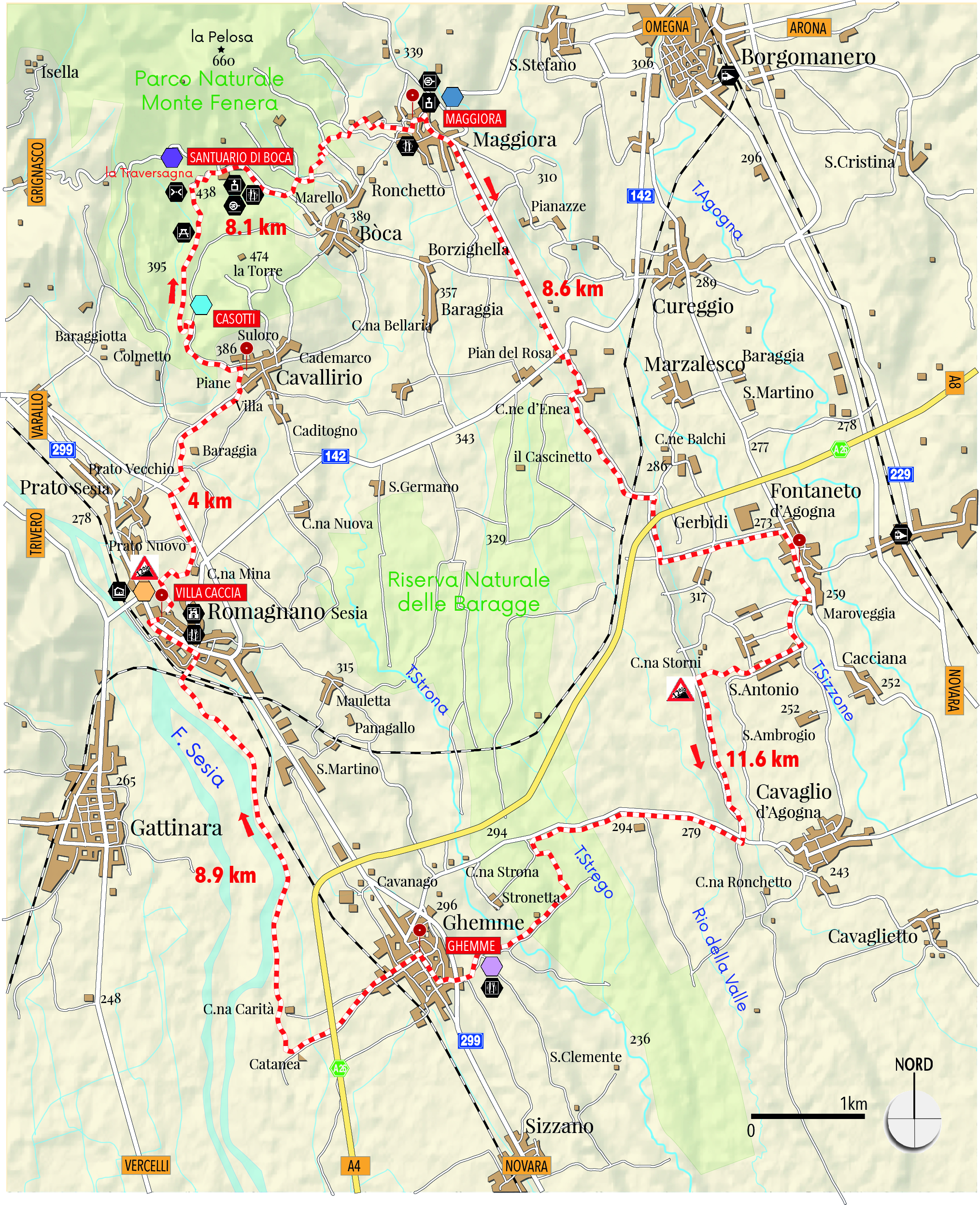 Partenza e arrivo: Romagnano Sesia (Villa Caccia, sede del Museo Storico Etnografico della Bassa Valsesia). Si raggiunge da Novara (29 km) utilizzando la SP 299 per la Valsesia. In treno si può utilizzare la linea Novara-Domodossola e scendere alla stazione di Fontaneto d’Agogna dove ci si immette sul percorso.