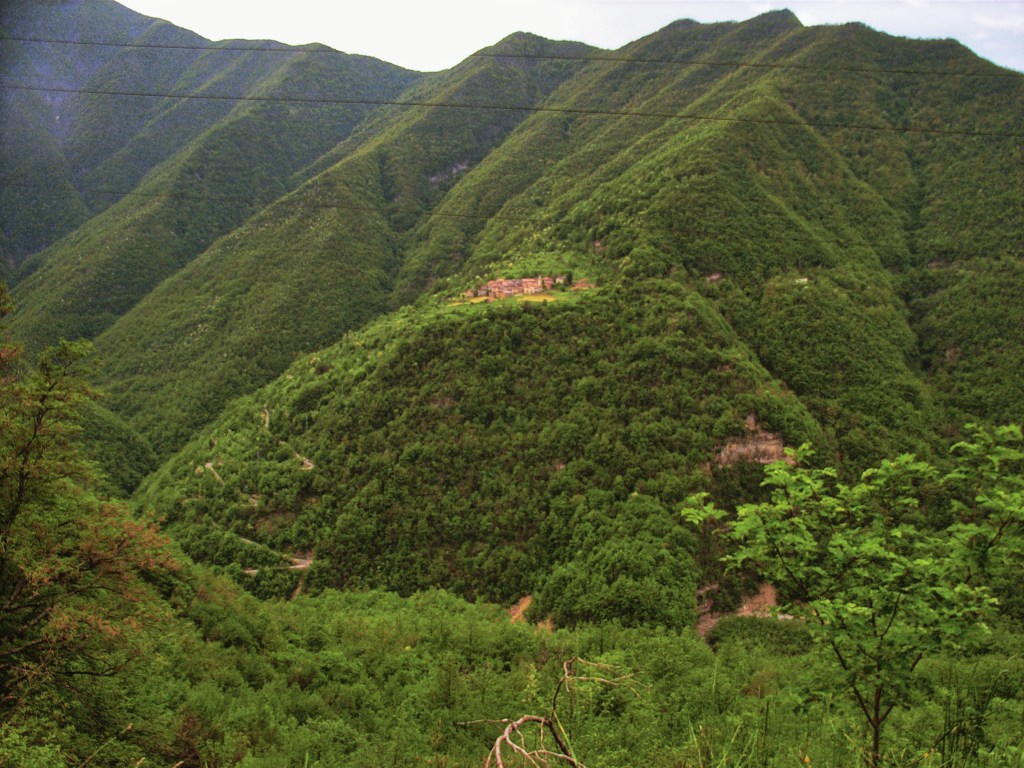 Dopo buon tratto di marcia si perviene a una biforcazione (alt. 1055, 3). La strada prosegue verso sinistra, guadagnando il crinale al passo della Maddalena (alt. 1407) per poi, dopo una tortuosissima discesa, mettere capo a Gorreto e quindi, al capoluogo comunale della valle, Ottone. Anche in auto è una fatica che comporta quasi un’ora di tempo, tanto per rimarcare lo stato di estremo isolamento dei villaggi della Val Boreca. Il prossimo che incontreremo è Suzzi, utilizzando appunto la direzione di destra dal bivio sopraddetto. Al primo tornante si può evitare la sterrata seguitando sulla traccia, in discesa, del vecchio sentiero dentro una melanconica successione di terrazzini coltivi in abbandono, fra muri a secco e piante da frutto inselvatichite. Un maiale e qualche magro bovino sono la misera compagine di un mondo agricolo ormai disfatto.