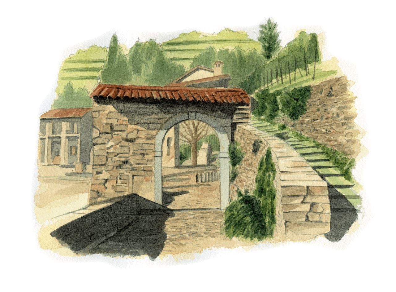 Ritornati sul percorso si accede ora a San Vigilio accostando la stazione superiore della funicolare e notando come ora il panorama sia del tutto diverso essendoci affacciati su Città Alta e sulla sottostante Bergamo moderna. Due ristoranti possono favorire una sosta accanto al frequentato crocevia (6, fontana) dove, un po’ discosta, sta la chiesa di San Vigilio. Quindi si riprende a camminare lungo il tratto superiore di Via San Vigilio fra leziosi villini. Subito si annuncia un secondo belvedere sulla valle di Astino (si nota bene l’ex-monastero), ma poco prima si stacca e si segue, a sinistra, Via San Sebastiano che, in lieve discesa, aggira le falde, tappezzate di ville, giardini esotici e terrazze coltive, di Monte Bastia. La zona, all’inizio del Novecento, era favorito luogo di villeggiatura da parte delle famiglie bergamasche più facoltose. Da apprezzare la fastosa Villa Viviani Rumi (civico 29), di stampo eclettico ma frutto del rimaneggiamento di un edificio del XVI secolo. Nell’insieme mostra un apparato decorativo di derivazione barocca ma che, nella torre laterale, rieccheggia gli oscuri tempi del Medioevo. Affacciato alla strada si vede anche una sorta di padiglione estivo la cui balaustra è coronata da statue. Si superano, sulla sinistra, dapprima la dimora “avita” del matematico Giuseppe Venanzio, e poi il “buen retiro” del chimico Giulio Natta, a cui nel 1963 fu conferito il Premio Nobel per le sue ricerche sui polipropileni, in altre parole, nel bene e nel male, la plastica. La via è stretta fra muretti in pietra e le pareti esterne delle ville. All’altezza del civico 13 si stacca, a destra, Via alle Case Moroni, un viottolo che corre su un terrazzino e che si usa prendere a testimone dell’antico aspetto dei percorsi pedonali dei Colli, prima dell’arrivo delle auto. Difatti si viene subito proiettati in una dimensione campestre: muro in pietra a destra, terrazzini gradonati a sinistra e, sullo sfondo, uno degli ultimi esempi di dimora rurale con portico e loggiato su colonnine in arenaria verdastra. Si tratta delle Case Moroni (7), già luogo di una tradizionale ‘frasca’ bergamasca.