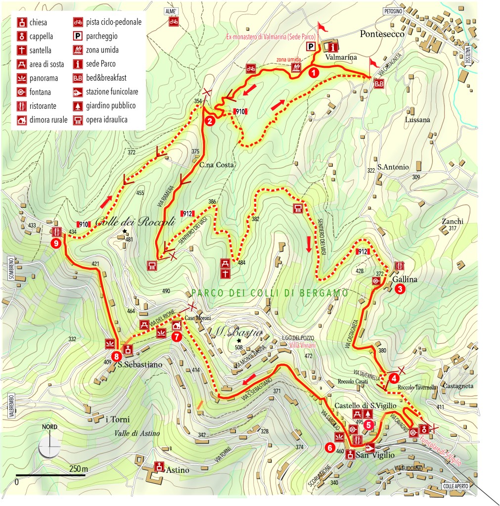 L’itinerario propone due punti di partenza, fra loro vicini: lungo Via Castagneta, raggiungibile da Pontesecco/Ponteranica; e al parcheggio di Valmarina, dov’è la sede del Parco dei Colli di bergamo. I due accessi si riuniscono (1) dopo poche decine di metri per poi procedere lungo la pista ciclo-pedonale del Parco, su fondo asfaltato.