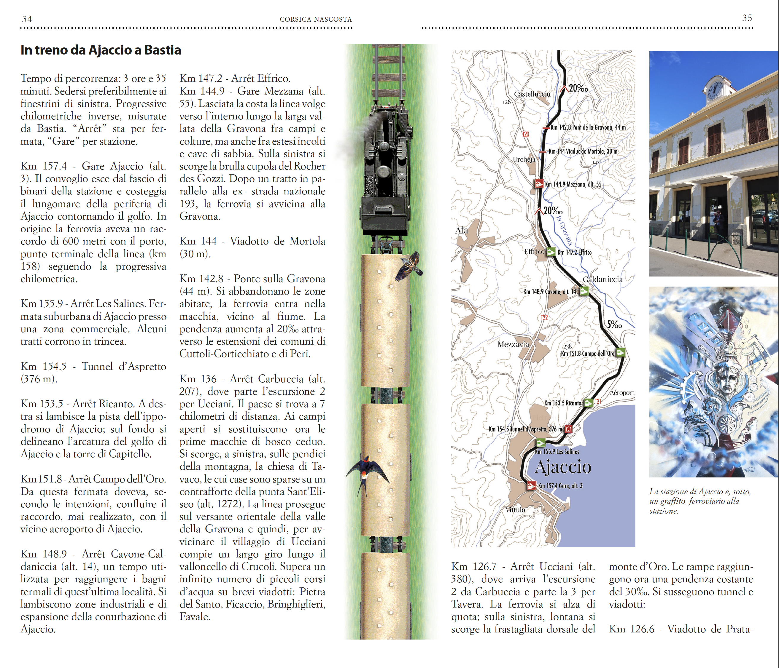 «Eravamo abituati alle alte velocità. Eravamo abituati alle stazioni diventate centri commerciali. Alle mega-stazioni delle nostre metropoli. All’andirivieni delle partenze e degli arrivi. Ai controlli e ricontrolli. Non eravamo abituati alla stazione di Palasca, dove cantano le cicale e dove ti puoi sedere tranquillo sul bordo della banchina con i piedi distesi sulla traversina. Non eravamo più abituati alla campanellina che, in modo cortese, ti avvisa dell’arrivo del treno o degli orologi pre-digitali con le lancette di ferro, un poco arrugginite, e fatalmente ferme su un tempo passato.» La guida contiene 24 passeggiate nel cuore dell’isola, da stazione a stazione, utilizzando la ferrovia. Inoltre la prima parte della guida descrive la storia e le vicende che hanno condotto alla realizzazione di questa bellissima ferrovia, dalla quale, in modalità dolce, si può apprezzare tutta la bellezza di un’isola-continente.