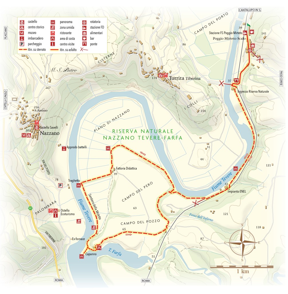 La visita alla riserva, se si utilizza il treno da Roma Tiburtina (stazione di Poggio Mirteto), richiede un tratto di avvicinamento lungo la sponda sinistra del Tevere, fino a entrare nel cuore dell’area protetta. Con la stazione alle spalle si inizia a percorrere, a destra, su marciapiede, la Strada regionale 313 nell’abitato di Poggio Mirteto Scalo. Al centro della rotatoria, in fondo all’abitato, campeggia una vetusta colonna ‘indicatore’ stradale: si utilizza la prima uscita a destra (Sp 15a), restando vicini alla ferrovia ed entrando subito nel territorio comunale di Torrita Tiberina: un lungo marciapiede protetto facilita il cammino. Appena superato il cavalcavia ferroviario (qui prestare attenzione!) e prima del successivo ponte sul Tevere, si imbocca a sinistra una stradina che corre parallela alla massicciata. Si entra nel perimetro della Riserva naturale all’interno della vasta valle del fiume. Una folta cornice di canne palustri impedisce per ora di scorgere il Tevere. Appare però più avanti, simile a un tranquillo specchio d’acqua poiché il suo deflusso è regolato dalla diga posta più a valle. Sulla sinistra, oltre la ferrovia, s’innalza la scarpata della valle, alta una ventina di metri, tutta coperta da un bosco ceduo. La stradina ora è a ridosso della sponda; oltre il Tevere, dietro una cortina di alberi avvolti dalle edere, si scorge la collina di Torrita Tiberina. Dopo aver superato un primo edificio Enel, si giunge a una biforcazione: si continua a destra, lungo la sponda del fiume. Lo Stradello, sterrato, asseconda l’ansa del Tevere, percorre una ripa ombrosa e umida, poi, finalmente, si allontana dal fiume tagliando trasversalmente una seconda ansa. Lo sguardo si apre sull’intera cornice del terrazzo che, sull’altra sponda del Tevere, delimita l’area della riserva e dove troneggiano gli abitati di Torrita e di Nazzano. Si entra nella larghissima prateria del Piano di Nazzano scompartita da fossi di scolo e infine si raggiunge la Fattoria didattica della Riserva. Qui si scende, verso destra, fra due alte siepi, per tornare vicino al Tevere, giusto all’altezza del traghetto a cavo che consente, quando in attività, il passaggio del fiume. In passato era utilizzato per il trasporto delle mandrie e delle greggi: veniva azionato a mano grazie a degli arganelli.