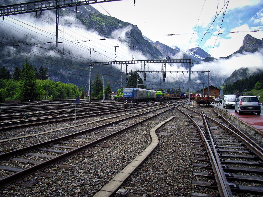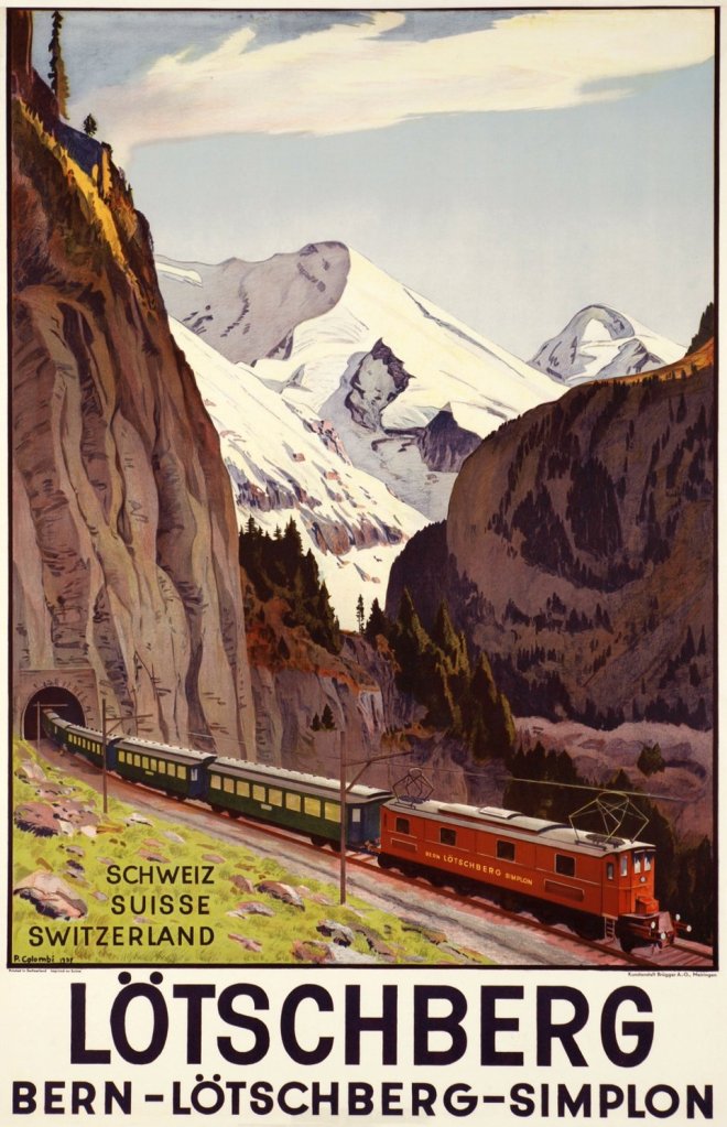 La storia della ferrovia. Poiché Berna si trovava, all’inizio del Novecento, isolata nei suoi collegamenti ferroviari dal baluardo delle più alte montagne del Paese e, in particolare, dalle importanti linee del Gottardo (1882) e del Sempione (1906), si decise la realizzazione di una linea diretta con il Vallese, anche senza la diretta partecipazione finanziaria della Confederazione, ma con le sole risorse proprie del Canton Berna. Nel 1891, alcune personalità della capitale ottennero la concessione per la costruzione di una linea tra Spiez e Frutigen, con l'opzione di estendere il percorso al Vallese attraverso un tunnel sotto il massiccio del Balmhorn. Il 25 luglio 1901 fu inaugurata la prima tratta Spiez-Frutigen, mentre il 27 luglio 1906 fu fondata la società privata BLS (Bern-Lötschberg-Simplon) per la costruzione e dell'esercizio della linea. Il 1° gennaio 1907. Intanto, gia nel 1906, erano iniziati i lavori per il grande traforo alpino dal portale nord di Kandersteg. Di particolare impegno, oltre alla galleria, anche le rampe d’accesso. La rampa nord misura 15 km con un dislivello di 429 metri fra Frutigen e il portale nord del tunnel a Kandersteg. La rampa sud, di 28 km, fu più laboriosa con i suoi 13 tunnel e per le difficoltà di accesso ai cantieri, spesso disimpegnati con carovane di muli oltre alle piccole ferrovie di servizio. La pendenza massima era stata fissata al 2,7% e la curvatura minima a 300 metri. Diversi gli incidenti nella fase di costruzione a causa di valanghe, improvvise inondazioni o crolli dei sostegni del cunicolo principale (nel 1908 vi affogarono 25 minatori). Per questi e altri motivi la data di apertura, prevista nel 1912, fu ritardata di un anno. Il 18 settembre 1913 fu definito il nuovo orario con sette treni al giorno da nord a sud e nove da sud a nord di cui quattro con destinazione internazionale. Benché predisposta per ricevere due binari, la linea rimase a binario unico fino al 1988. Alcuni dati: scartamento ordinario, alimentazione elettrica a 15 mila V, lunghezza da Spiez (alt. 630) a Briga (alt. 678) 74 km, culmine a 1240 metri nel tunnel del Lötschberg.