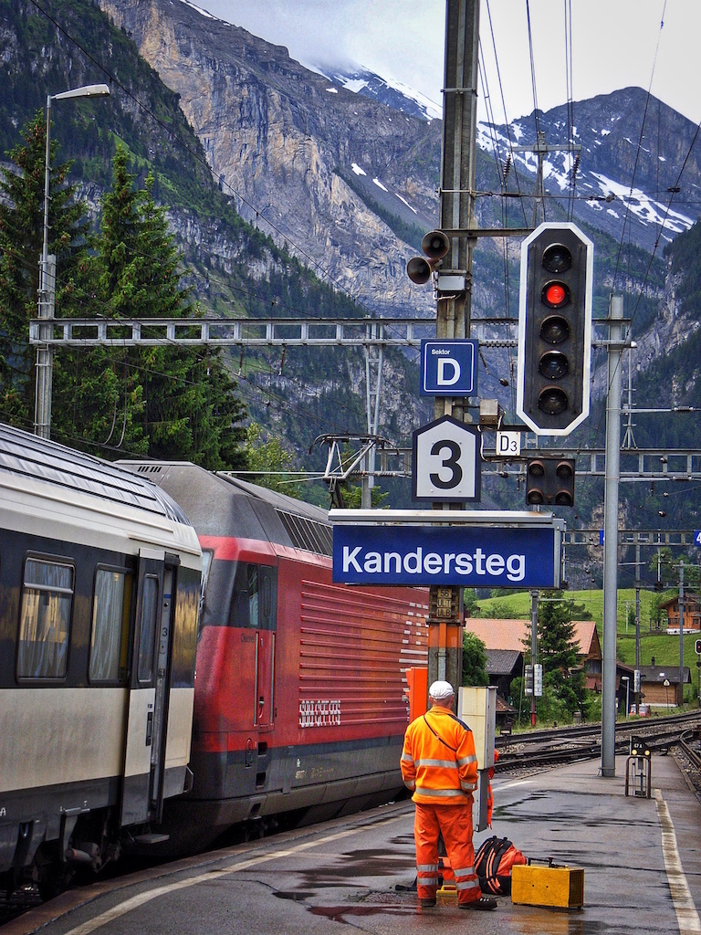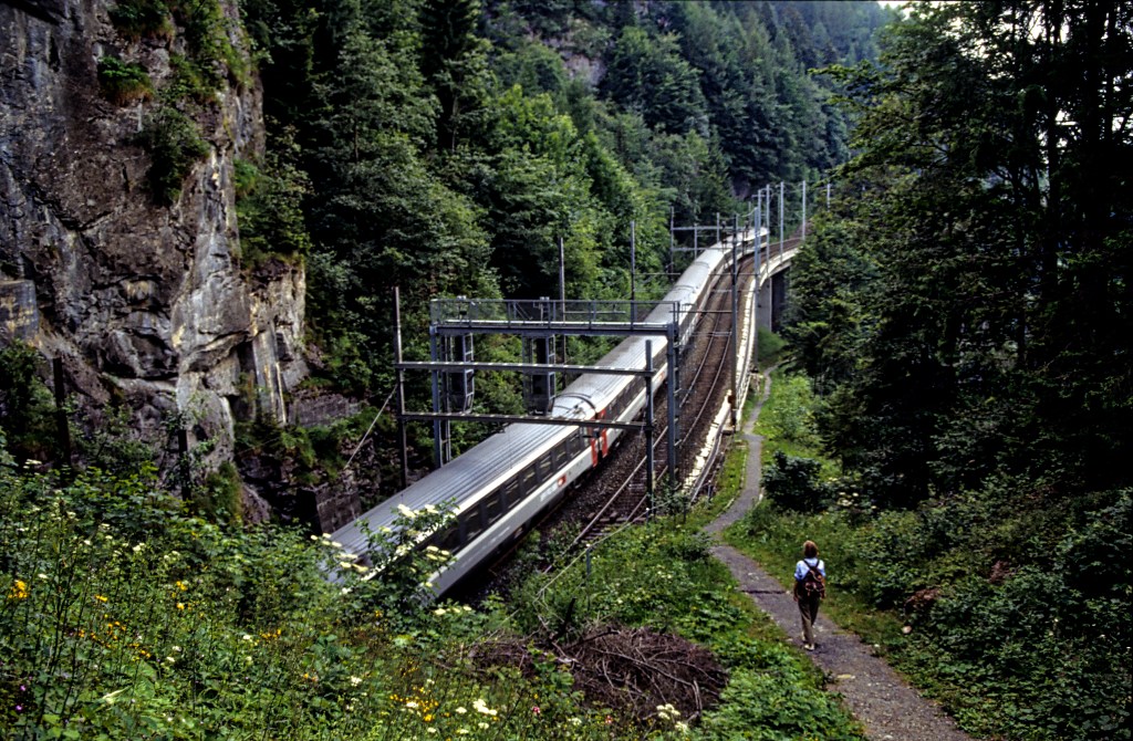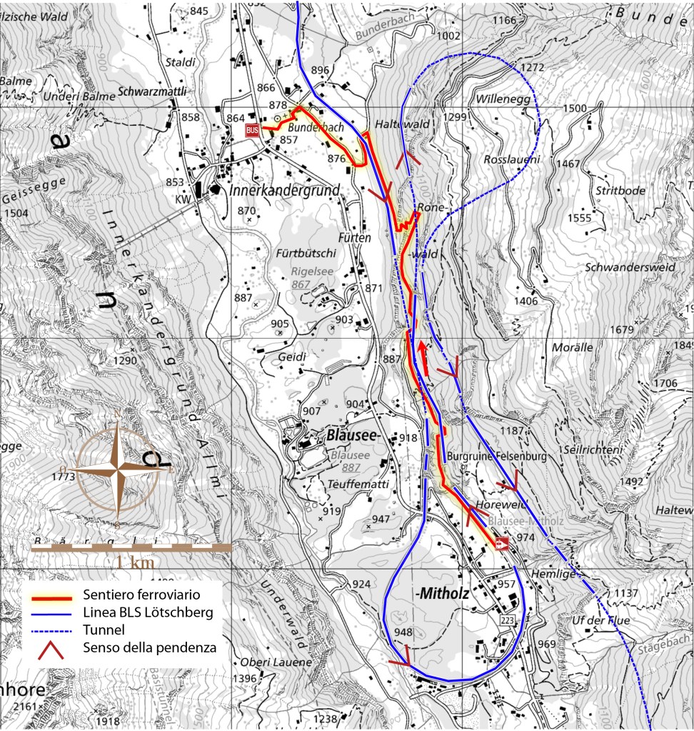 Dopo lo sprone roccioso il sentiero si riporta lungo la strada ferrata. In questo tratto essa supera un notevole dislivello (da 900 a 1100 metri circa d’altezza) grazie a due rampe elicoidali, una delle quali in galleria. Il sentiero segue fedelmente il tratto mediano che collega le rampe, dove i binari hanno una pendenza media del 27 per mille. In pratica, nello spazio di poche decine di metri in larghezza, si trovano quasi sovrapposti tre segmenti di linea ed è curioso udire spesso l’arrivo di un convoglio senza intuirne la provenienza. Pesanti treni merci trainati da uno o più locomotori si alternano a brevi intervalli con veloci Intercity. La distanza fra i segnali di blocco automatico consente un distanziamento di tre minuti e mezzo fra un treno e l’altro. L’intera tratta è comandata a distanza dalle stazioni di Frutigen e di Kandersteg.