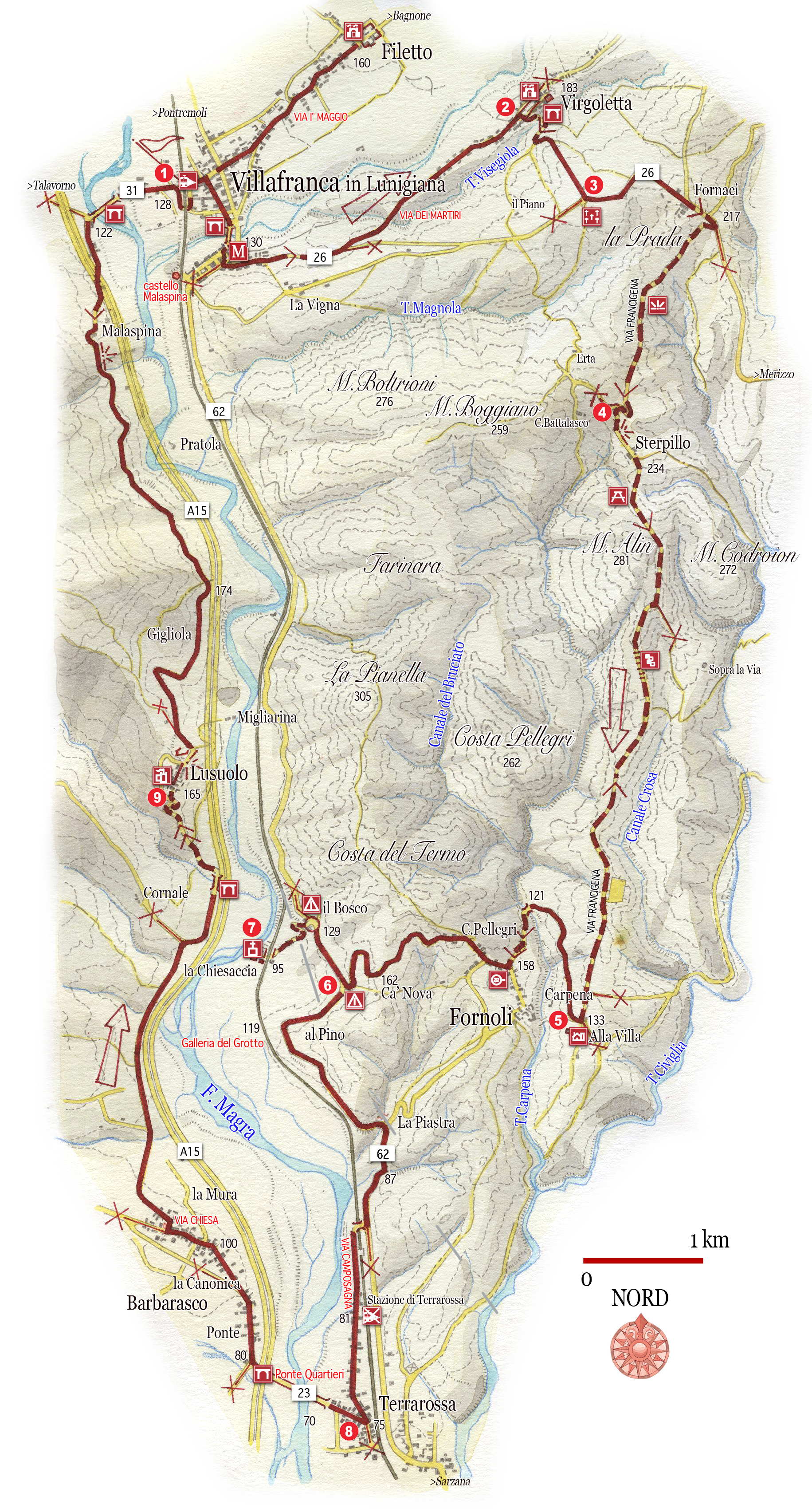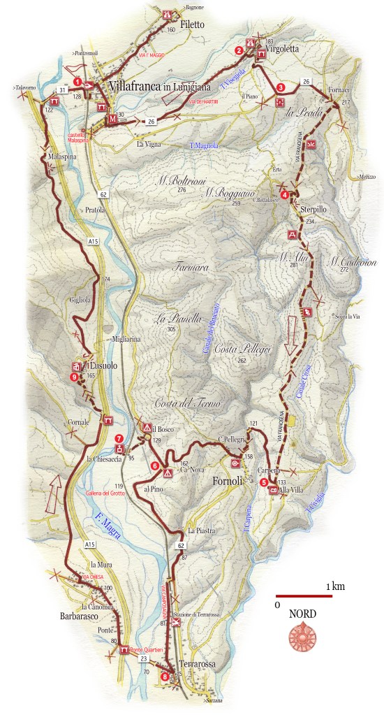 Lusuolo (9) è allineato lungo una via centrale in pendenza sulla dorsale di un colle. In cima al villaggio si erge il castello, risalente alla metà del XIV sec. quando il piccolo feudo di Lusuolo, per divisione ereditaria, finì nelle mani di Azzone Malaspina. Il sito fu conteso da genovesi e fiorentini. Seguendo la strada che lambisce dal basso l’altura del castello si procede in direzione di Villafranca. La strada serpeggia sul fianco della collina aprendo vedute sul fondovalle, solcato dal nastro dell’autostrada. Man mano si inizia a scendere. D’un tratto si scorgono, al di là del fiume, lo sprone su cui fanno muta impronta i ruderi del Malnido malaspiniano e la retrostante Villafranca. Giunti in fondovalle si segue a destra la strada che, oltre il ponte sulla Magra, fa rientro nell’abitato e alla stazione ferroviaria (km 25.6).