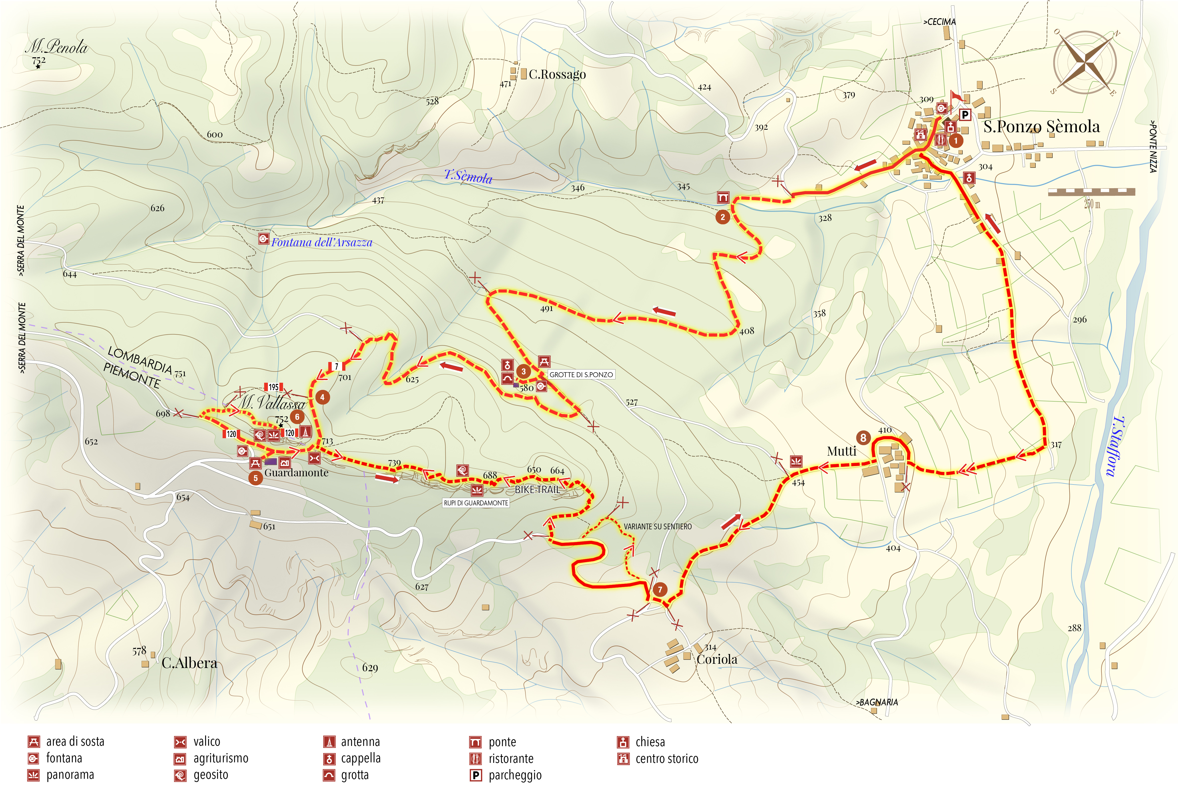 Segnavia: 07 da San Ponzo Semola a Guardamonte; 195 e 120 per la salita al M. Vallassa; non segnalato dal bivio del sentiero 07 fino all’arrivo.
