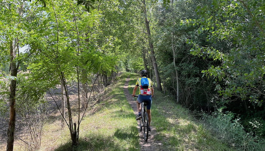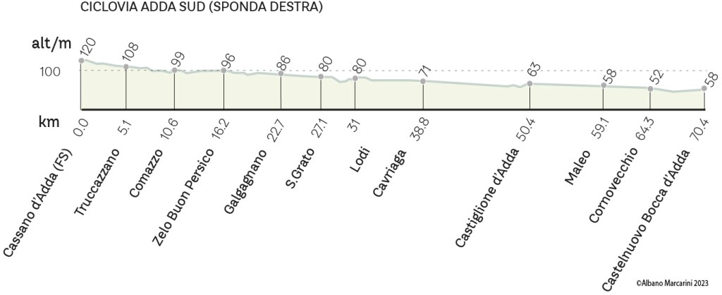 A sud di Cassano d’Adda, il fiume, lasciata la valle del suo medio corso, profondamente incassata nella pianura, raggiunge il livello della pianura e prosegue con larghe e sinuose anse verso la sua destinazione finale nel Po. La ciclovia, che prima si era dipanata lungo la sponda di destra da Brivio a Trezzo sull’Adda e oltre, si divide ora in due tronconi paralleli, ognuno su una delle due sponde, all’interno del Parco regionale Adda Sud. Iniziamo a trattare il percorso in sponda idrografica destra che si sviluppa nel territorio della Città Metropolitana di Milano e nella provincia di Lodi. Si tratta di un percorso stradale, con molti tratti su piste ciclabili protette, facenti parte della Rete Ciclabile della Martesana e della provincia lodigiana. Ha il solo cruccio di tenersi a una certa distanza dal fiume, al punto che non si ha mai la possibilità di costeggiarlo lungo le sponde. Esiste però la possibilità di seguire, con una gravel o una mtb, una ‘Variante naturalistica’ che entra e attraversa i boschi della golena dell’Adda, da Marzano a Lodi con diversi affacci sul fiume e nessun passaggio in centri abitati. Questa variante presenta anche alcuni tratti in single track quando attraversa il Bosco del Mortone. Il percorso stradale, di 70.4 km, interessa diversi abitati fra cui Lodi, con il suo ricco centro storico. Ma pure interessanti per varie presenze monumentali Corneliano Bertario, Comazzo, Castiglione d’Adda, Maleo e Castelnuovo Bocca d’Adda dove la ciclovia si chiude, collegandosi con la dorsale ciclabile del Po in direzione Pavia o Cremona e con il percorso ciclocampestre del Colatore Venere. Notevole, come accennato, il computo dei tratti su pista ciclabile: ben il 65% della lunghezza totale del percorso, valore che pone questa ciclovia ai livelli più alti nell’insieme della rete lombarda. Molto suggestivo, ad esempio, il tratto continuativo fra Lodi e Castiglione d’Adda di 18 km, ricavato sulla dismessa sede della vecchia strada di collegamento fra i due centri. Il paesaggio è quello tipico della bassa pianura irrigua lombarda, con prevalenza di colture cerealicole e di prati a foraggio, questi ultimi specie nel Lodigiano. Da rilevare la costante e capillare presenza dei corsi d’acqua con la funzione fondamentale di collettori irrigui per l’agricoltura.