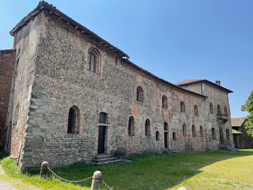 CORNELIANO BERTARIO. Una vera sorpresa. Si annuncia con la chiesa, posta di sguincio sulla sinistra della strada, e si apre poi con un piazzale erboso dominato sul lato lungo dal corpo del castello. Cascine e poche intromissioni moderne conferiscono un tono autentico al borgo. Nel 1359 i terreni di Corneliano furono donati da Barnabò Visconti all’Ospedale milanese di Sant’Ambrogio con la facoltà di prelevare gratuitamente acqua dalla Muzza per quanto bastasse a irrigarli. Fu un gesto generoso nel tentativo di farsi perdonare le sue malefatte e, forse, gli sfrenati eccessi della consorte, Regina della Scala. Di quel periodo è forse il castello, che presidiava un ‘passo’ dell’Adda già utilizzato nel 1158 dal Barbarossa trovando ostruita la più agevole via di Cassano. Si dice avesse perso 200 uomini nel passaggio del fiume di cui, evidentemente, la portata d’acqua era ben superiore di quella attuale. La parte più antica del maniero è la torre quadrata sull’angolo del piazzale, con le sue massicce mura tratte da materiali di recupero.