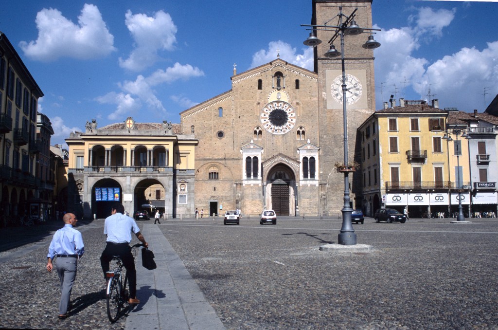LODI. L’antica Lodi, chiamata Laus Pompeia, fu distrutta due volte dai Milanesi, nel 1111 e nel 1158. Federico Barbarossa ne consentì e incoraggiò la ricostruzione con donazioni e privilegi. Laus Nova crebbe in posizione più defilata, sulla sponda destra dell’Adda. La riconoscenza dei Lodigiani verso l’Imperatore non venne mai meno. A lui, caso unico in Italia, è tuttora dedicato un busto, collocato alla base della loggia comunale assieme a quello del fondatore romano Pompeo Strabone. Da antagonista di Milano, Lodi, dopo il 1311, diverrà vassalla e presidio del Ducato visconteo, con un giro di mura. Nel contempo però i progressi agricoli e l’estensione delle aree coltivate la porteranno a primeggiare come mercato dei prodotti delle campagne. Nel Medioevo il cuore di Lodi era avvinto fra il palazzo comunale, il Duomo, la canonica e la via che conduceva al ‘porto’ sull’Adda. Tre porte si aprivano sulle vie di Milano, di Pavia e di Cremona. Una ‘città bassa’, prospiciente al fiume, era riservata alle attività mercantili, mentre una ‘città alta’ (ma il dislivello era valutabile in un paio di metri) era sede della nobiltà e delle istituzioni. L’attuale centro storico ha subìto poche trasformazioni edilizie (il suo tessuto risale, nel complesso, ai secoli XVII-XIX) e, seppur privato dei bastioni perimetrali, risulta ancora ben leggibile: la forma pentagonale richiama gli schemi delle cittadelle militari; gli isolati sono ampi e fittamente lottizzati; le case più vetuste hanno altezza uniforme e si interpongono variamente fra i palazzi nobiliari e le chiese, come si nota nella cornice porticata di piazza della Vittoria. Quest’ultima fa da contraltare alla vicina piazza del Mercato, luogo dei commerci e degli scambi.
