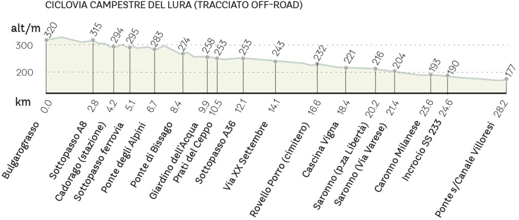 Fondo: asfalto 8%, la restante parte su fondo naturale stabilizzato e scorrevole o su sentiero. Segnaletica: presente, ma in alcuni punti deficitaria (in generale, da nord a sud, seguire l’indicazione ‘Saronno’).