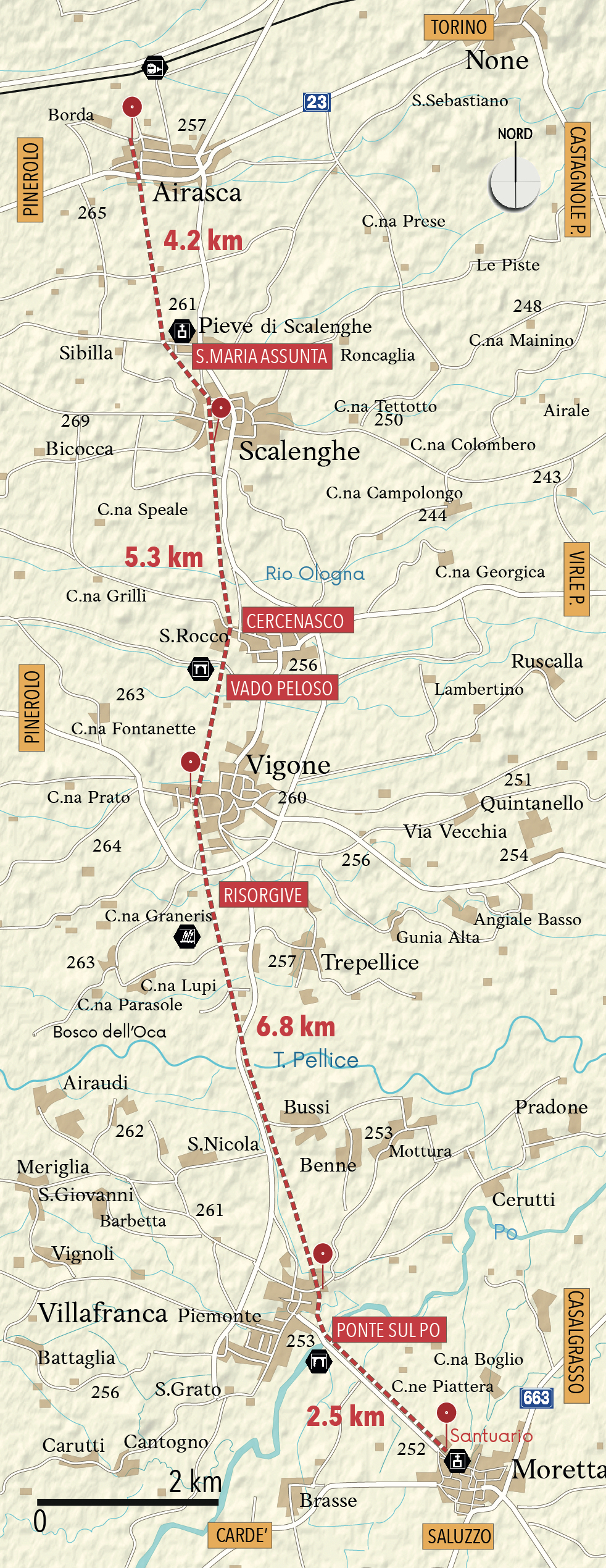 Da Villafranca si arriva, dopo 3 km, a Moretta, abitato preceduto dal santuario della Beata Vergine del Pilone (1685-1691), dove termina la Via delle Risorgive iniziata ad Airasca. Da annotare il passaggio del Po su un ponte realizzato nel 1884, ma di cui si sa di un ponte originario in legno addirittura del 1290, soggetto a pedaggio. Accanto ad esso vi era un ‘porto’ dove si praticava una navigazione di modesta portata verso Torino. Non a caso l’atto che per la prima volta cita l’esistenza di Villafranca nel 1197 dice: «actum ad Villafrancam in ripa Padi super portum».