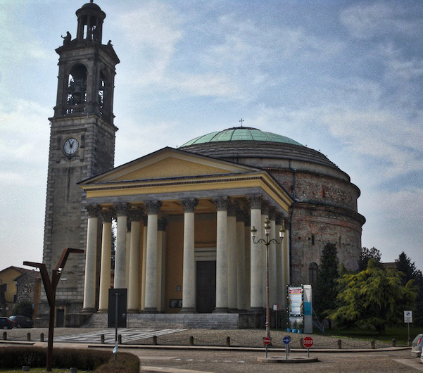 GHISALBA. Una deviazione ci consente di ammirare la chiesa di S.Lorenzo levita, che segue la consuetudine dei centri della pianura – oltre a Ghisalba, Urgnano, Calcio, Cologno al Serio – di erigere chiese di enormi dimensioni che sovrastano con le loro cupole la schiera dei cascinali. L’edificio, detto popolarmente ‘la Rotonda’ fu concluso nel 1834 e si dovette all’ingegno di Luigi Cagnola, massimo fra gli architetti della Lombardia neoclassica. A suggello di uno stile largamente in voga, l’autore imitò la Rotonda di Possagno del Canova. La facciata si presenta con un pronao di 14 colonne, a somiglianza di un tempio pagano. All’interno, lo spazio circolare è scandito da 12 finte colonne addossate alle pareti, mentre un fascio di luce, attraverso un oculo, piove dalla sommità della cupola. Anche l’altare maggiore è disegno del Cagnola.