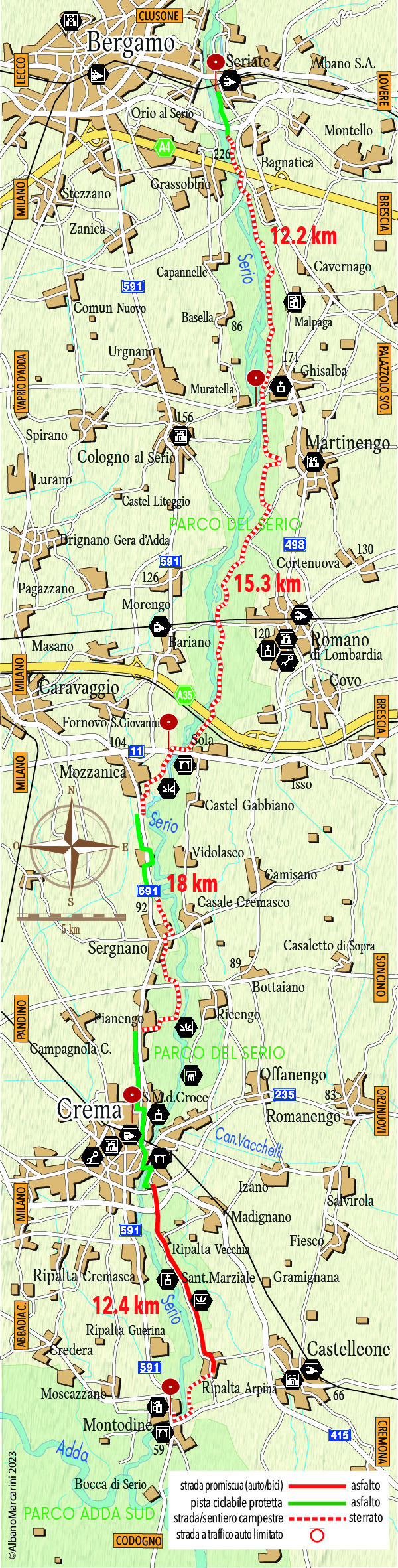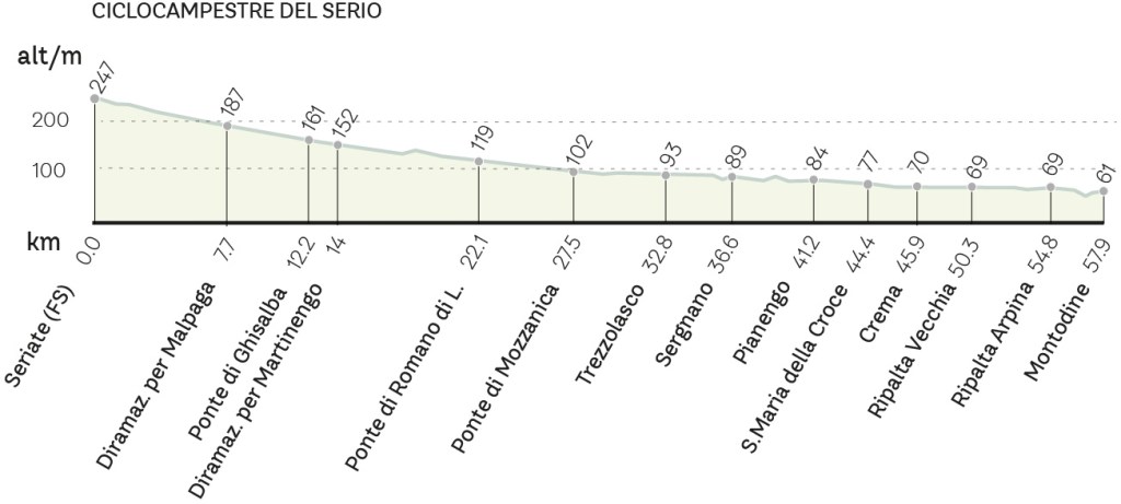 Il Serio è un fiume anomalo rispetto agli altri fiumi lombardi, con aspetti paesaggistici interessanti. Da Seriate fino a Romano di Lombardia ha un alveo ampio, quasi al livello della campagna e percorso da una sequenza di rami paralleli e intersecantesi. Le scarpate laterali non superano i 4 o 5 metri ed è improprio definire questo tratto ‘valle’, almeno nel modo con cui intendiamo questo termine rispetto all’Adda e all’Oglio, il cui solco è molto più scavato in profondità. Uno dei motivi di questa differente morfologia dipende, per il Serio, dalla mancanza di un lago prealpino in grado di trattenere i materiali alluvionali. Questi si depositano nella pianura alzando il livello dell’alveo. Per i geologi il terrazzo fluviale segue un allineamento che va dal Cassinone (frazione di Seriate) a Malpaga. Fra un ramo e l’altro si allungano delle isole, o ‘gere’, ciottolose popolate da vegetazione pioniera, sopraffatta dalle periodiche piene del fiume. In primavera e in autunno la portata d’acqua è pari a 40 volte quella di magra con piene devastanti per l’assetto idrogeologico del territorio. Altro fenomeno insolito l’inabissamento delle acque che fra Seriate e Ghisalba scorrono in estate nel sottosuolo lasciando il greto asciutto e desolato. Lo strato ciottoloso è permeabile sicché è frequente il forte assorbimento delle acque, specie nei momenti di magra. Avendo tempo e voglia sarebbe curioso osservare le colorazioni dei sassi trasportati a valle e intuire le loro provenienze. Vi scorgeremmo i grossi ciottoli rossastri arrotondati del Verrucano lombardo, unità geologica risalente a circa 250 milioni di anni fa, ma anche le bianchissime, opalescenti, pietre di quarzo o le selci dagli spigoli appuntiti. Ingenti gli accumuli di pietre calcaree, inframmezzate da rocce metamorfiche grigie, solcate da bande biancastre. Non mancano in alcuni punti affioramenti di ‘ceppo’, formato dalla cementificazione delle ghiaie e spesso usato come pietra ornamentale. A valle di Crema poi, stranamente, il Serio si comporta come l’Adda, ovvero si incassa in un solco non profondo ma tale da determinare una piccola valle tanto che i paesi che vi stanno vicino si chiamano ‘ripalte’, ripe alte. In questa guida abbiamo trattato per tre volte del Serio: per la parte montana, divisa in due ciclovie (Val Seriana e Alta Val Seriana), e per quella di pianura, qui descritta. La ciclovia che segue la porzione di pianura è adatta a bici robuste (gravel o mtb) per via dei lunghi tratti su sterrato. Collega Seriate, vicino a Bergamo, con Montodine, dove il Serio confluisce nell’Adda. Per questo motivo abbiamo preferito il termine di ciclocampestre rispetto a ciclovia. Non mancano alcuni tratti ‘critici’, vale a dire sconnessi, fangosi o polverosi, ma sono una piccola percentuale sulla distanza complessiva. Il percorso è stato oggetto di valorizzazione nel 2021 nell’ambito del Progetto Musica nel Vento, teso ad unire Bergamo con Cremona, capitali dell’arte musicale lombarda.