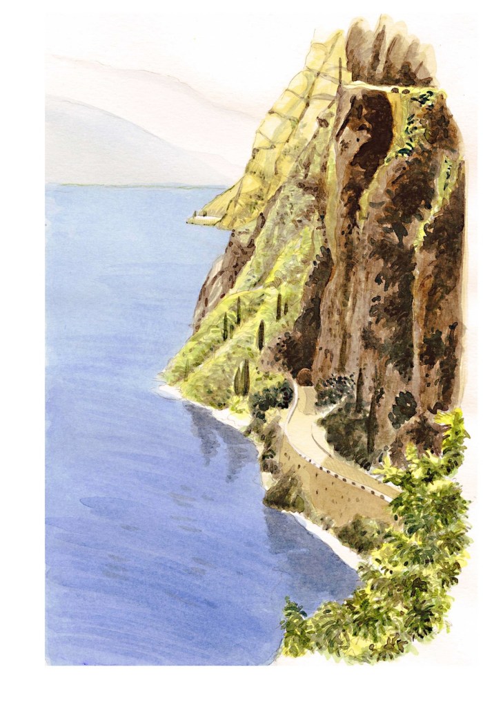 Dalla parte di occidente la montagna si avvicina a gradi al Lago di Garda, prima con dolci declivi di ulivi, poi man mano che si procede verso nord con pareti di roccia strapiombanti. A un certo punto, poco prima di Riva, dove il lago si chiude, la montagna è una muraglia verticale, alta centinaia di metri, che s’inabissa nell’acqua senza sbalzi o gradini. Le strade non riescono ad aggrapparsi alla roccia, ma ne scavano l’interno con gallerie e lunghe caverne. Le ombre del giorno raggiungono presto questo luogo e lo oscurano facendolo sembrare ancor più impressionante. Dalla soleggiata Riva del Garda si guarda questa sponda con un misto di stupore e attrazione fino a scorgere, quasi impercettibilmente, una stretta fessura, un taglio nella roccia che coincide con la valle del Ponale, erosa in profondità da un torrente che si scarica a lago con salti di quota e una cascata oggi impoverita dalle captazioni idrauliche ma, nel 1897, tanto cara allo scrittore Rainer Maria Rilke da convincere per lettera un’amica di andarla assolutamente a vedere.