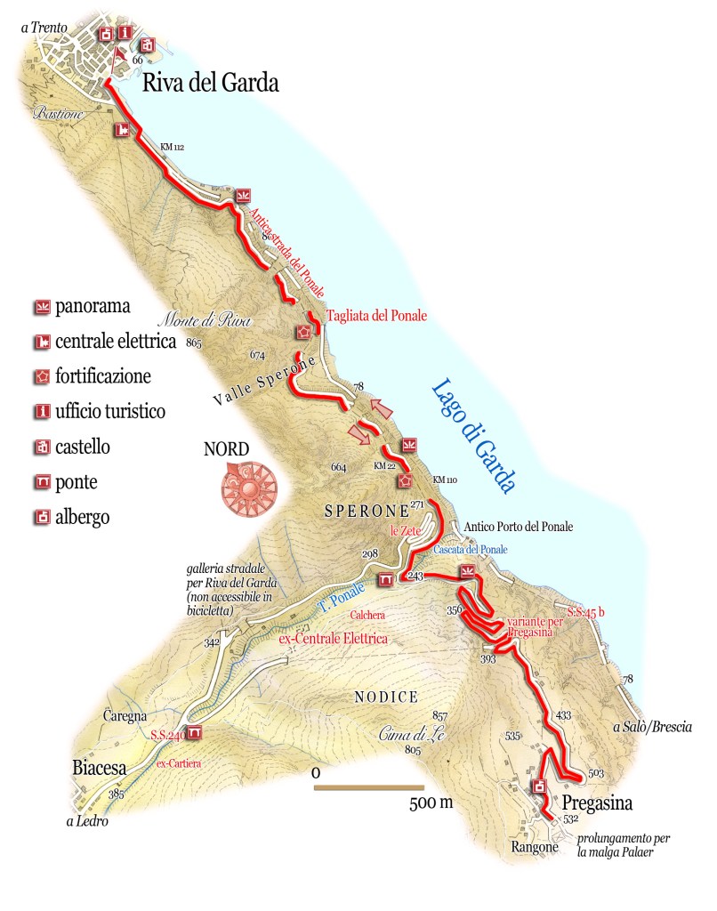 Da fare in più: la strada del Ponale può essere il trampolino di lancio di un giro molto più lungo e impegnativo che comprende la salita al rifugio Pernici e alla Bocca di Trat (alt. 1581) con successivo ritorno a Riva del Garda per complessivi 40 km con un dislivello di 1600 metri. La traccia di questo itinerario è scaricabile, con molti altri, al sito www.gardatrentino.it/percorsi-MTB
