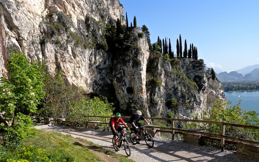 Itinerario in mtb o e-mtb sulla sponda occidentale del Lago di Garda, lungo la vecchia Strada del Ponale, oggi Sentiero Giacomo Cis, nei comuni di Riva del Garda e Molina di Ledro, nella Provincia Autonoma di Trento.