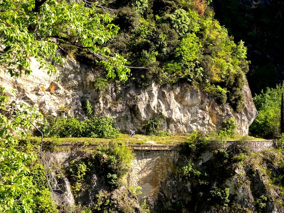 Più avanti si aggira la scoscesa valle dello Sperone, poi si torna a precipizio sul lago, ormai a più di 200 metri d’altezza. La strada alterna le gallerie a lunghe balconate panoramiche. Infine si arriva al solco della valle del Ponale e alla biforcazione dove, a destra, si annunciano le ‘zete’, una ravvicinata serie di tornanti che vince un altro salto di quota per ricollegarsi alla moderna strada della Valle di Ledro. Il nostro itinerario di tiene invece verso sinistra; supera il ponte sulla valle del Ponale e quindi rimonta l’altro versante dell’orrida e cupa gola dove, per uno strano fenomeno termico, prolifera la vegetazione mediterranea di lecci, roverelle, cipressi.