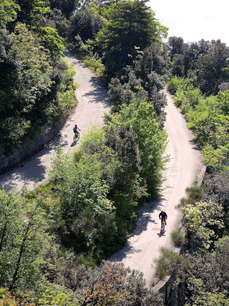 Nonostante l’aspetto ostile, qui l’uomo ha intessuto una trama, prima di sentieri poi di strade. Ha lavorato e combattuto poiché, fino al 1918, vi era tracciato il confine fra Italia e Austria-Ungheria. Così, quella che sembra una vertigine inviolabile, in realtà è un crivello di anfratti, grotte, postazioni, difese, muraglie. La strada, realizzata nel 1851 grazie all’opera munifica dell’imprenditore trentino Giacomo Cis, collegava il lago con la Valle di Ledro e disimpegnava l’apparato difensivo austriaco potenziato a più riprese fino alla Prima guerra mondiale.