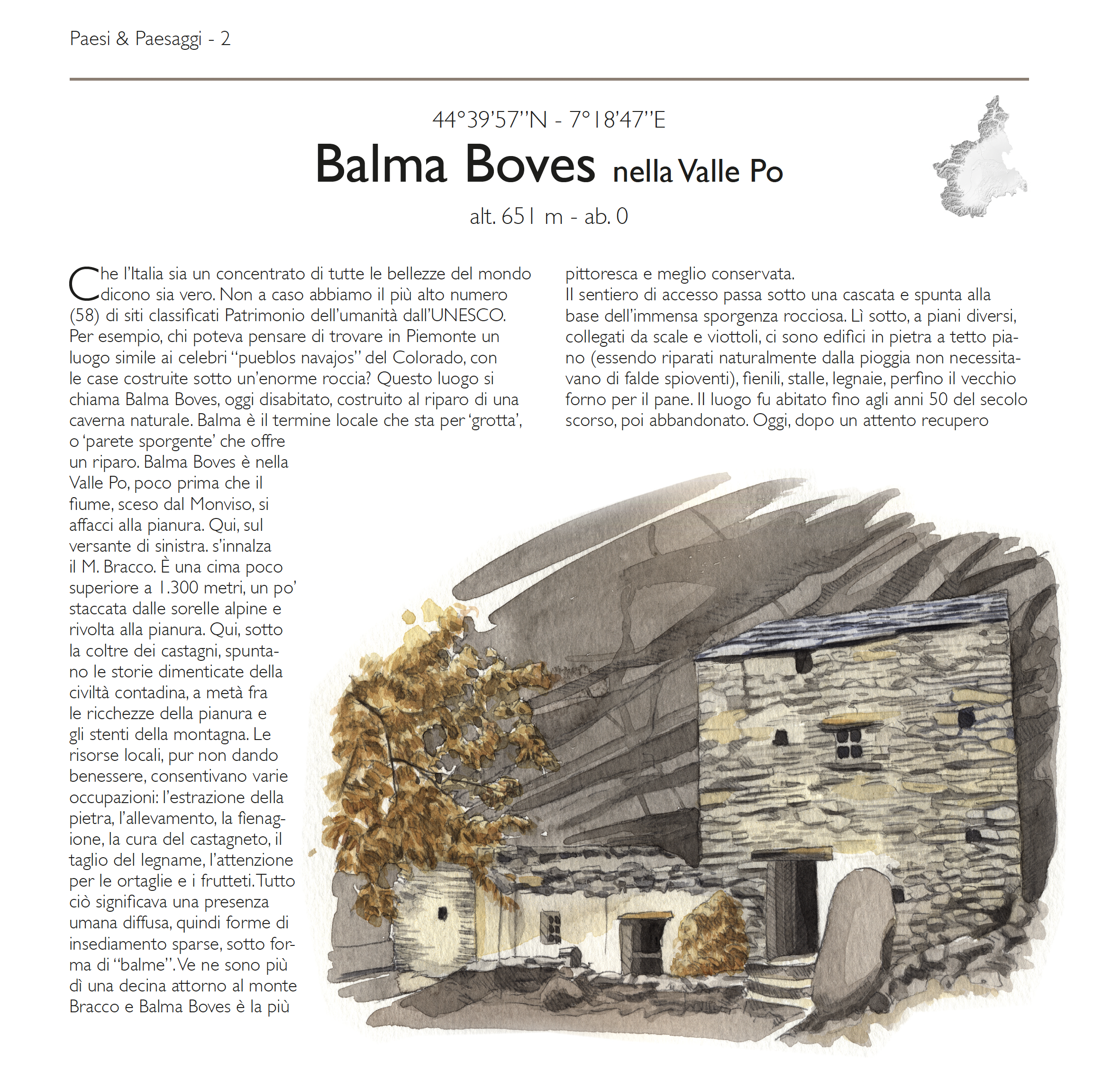 Allo sbocco della Valle Po sorge una montagna. Si chiama Monte Bracco e pare sia stata visitata da Leonardo da Vinci. Ha una forma strana e alcuni, in passato, la scambiarono addirittura per un vulcano. Alle sue falde ci sono cascinali e villaggi, ma soprattutto c’è un nucleo un tempo abitato, del tutto originale: Balma Boves. Le sue case in pietra sono riparate da una caverna naturale che le rende simile a quelle che nel Colorado usavano i nativi americani.