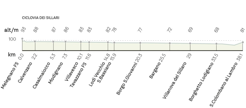 Distanza: 38.2 km – Dislivello: 60 m – Tempo di percorrenza: 2h 20’ – Altezza massima raggiunta: 94 m alla partenza. Altezza minima raggiunta: 55 m al ponte sul Lambro, poco prima di S.Colombano. Tipo di percorso: in prevalenza strade provinciali a basso traffico, tratti di pista ciclabile, strade campestri. Fondo: asfalto 70%, la restante parte su fondo naturale o sterrato. Segnaletica: assente. Mezzo consigliato: gravel, mtb, bici da turismo con battistrada rinforzato. Difficoltà: bassa. Aree protette: Parco dei Sillari, Parco Agricolo Sud Milano.