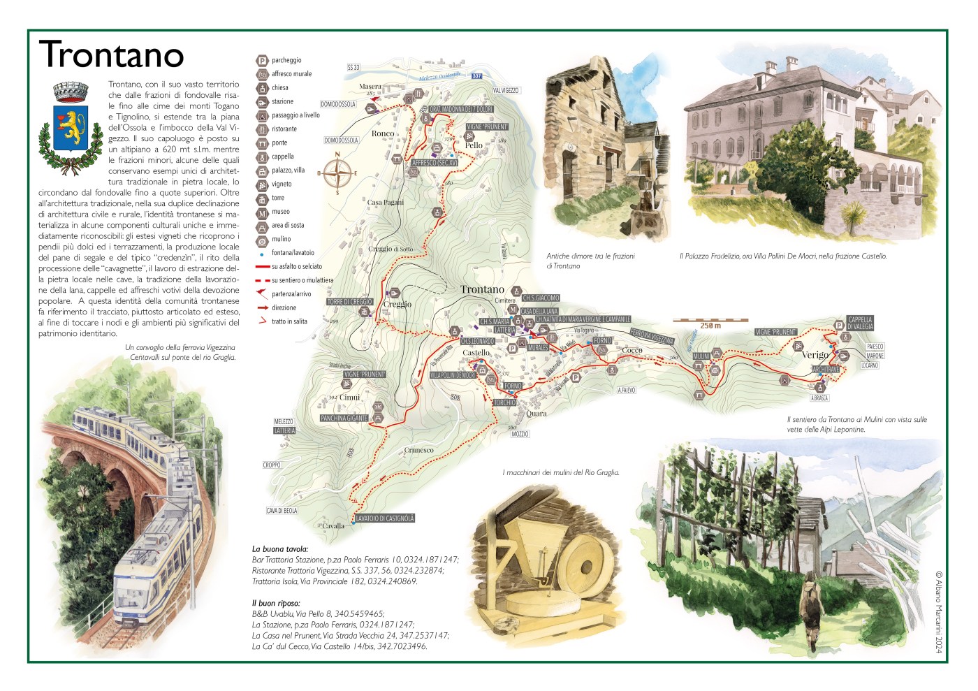 Sono undici percorsi “del tempo e dello spazio”, dei quali qui vi presento quello dedicato a Trontano. Si compone di una tavola con un itinerario di visita a piedi (in colore rosso) e con alcuni miei acquerelli presi durante il sopralluogo. Sono villaggi incantevoli, lontano dalle strade più battute, che rivelano ancora l’atmosfera dei tempi passati e una giusta armonia fra uomo e natura. Sono sentieri facili e ben tracciati, percorribili in ogni età. Sono certo che vi faranno passare una ripagante giornata all’aria aperta.
