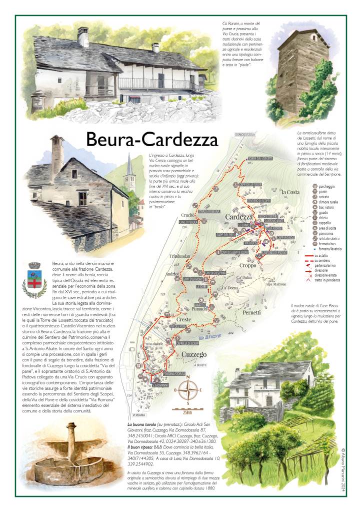 Il nucleo di Beura, unito nella denominazione comunale insieme alla frazione di Cardezza, deve il suo nome alla beola, roccia tipica dell’Ossola ed elemento essenziale per l’economia della zona fin dal XVI secolo, periodo a cui risalgono le cave estrattive più antiche. La sua storia, legata alla dominazione Viscontea, lascia tracce sul territorio, come i resti delle numerose torri di guardia medioevali (tra le quali la Torre dei Lossetti, toccata dal tracciato) o il quattrocentesco Castello Visconteo nel nucleo storico di Beura.
