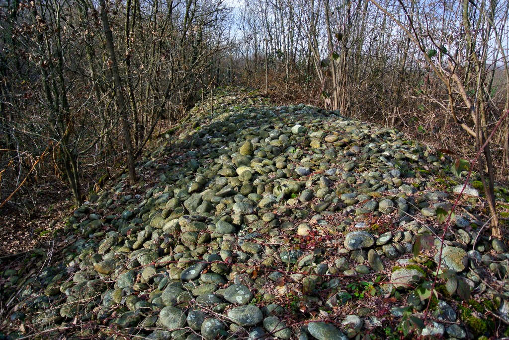 4.Punto nodale del percorso il tratto residuo di una ‘strada romana’, visibilmente sopraelevata con una grossolana pavimentazione selciata in grossi ciottoli e con i segni dei solchi carrai. Si prolunga per circa 30 metri e sale dalla riva verso la collina, disegnando un’ampia curva. La strada, forse tracciata in età costantiniana (IV sec.) univa con tutta probabilità Eporedia (Ivrea) con la scomparsa Quadrata, l’altra colonia romana posta sulle sponde del Po fra Verolengo e Crescentino. La datazione tardiva fa pensare che la strada sopraggiunse quando già le miniere erano state abbandonate.