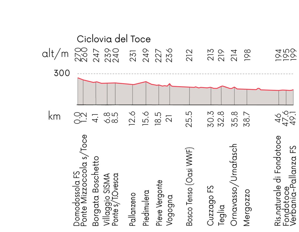 Lunghezza: 49.1 km. Dislivello: 110 m Altezza massima raggiunta: 270 m. a Domodossola Altezza minima raggiunta: 190 m a Fondotoce Tempo di percorrenza (15 km/h): 3h45’ Tipo di strada: sentiero o carrabile campestre (18 km), pista ciclabile sterrata (13.3 km). Fondo: sterrato (24 km). Mezzo consigliato: mountain-bike, gravel. Quando andare: sempre, molto umido e freddo in inverno in assenza di soleggiamento. Difficoltà: facile. Segnaletica: pannelli illustrativi del percorso.