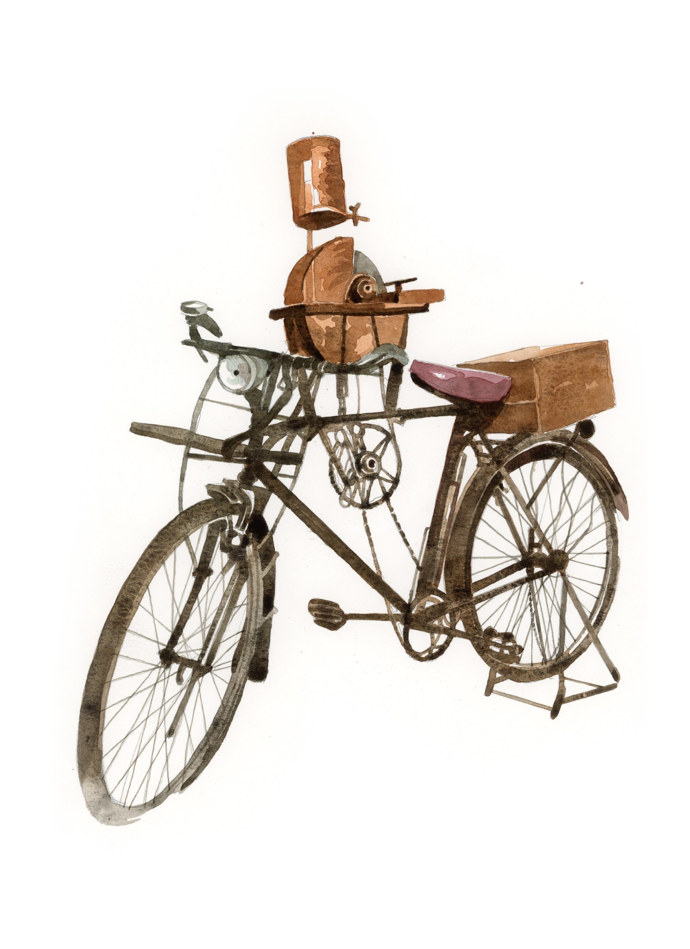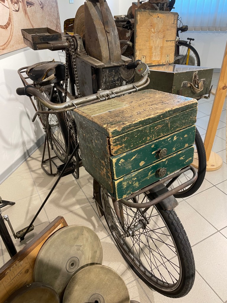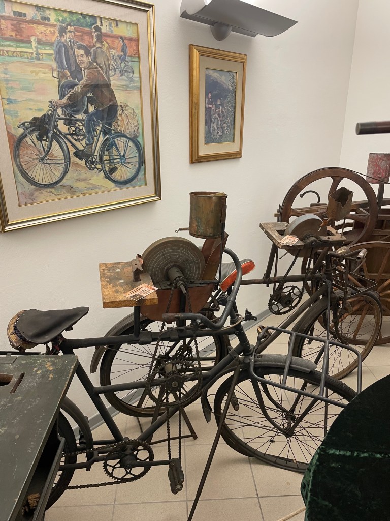 Erano mestieri che si tramandavano di padre in figlio e si vedevano fanciulli di 10 -12 anni accompagnare il genitore in viaggi che potevano arrivare fino a Vienna, a Milano, a Trieste o a Budapest. Le macchine con la mola – la “krösma” – erano portate a spalla o spinte su carrettini a due ruote, ma nel 1927 ecco la novità. Per primo, il resiano Valente Isidoro Bonbòn applica la mola direttamente sopra una bicicletta che pedalando da fermo la faceva girare. Una trovata rivoluzionaria che avrebbe ampliato, grazie a un mezzo di trasporto facile ed economico, il raggio d’azione degli arrotini ambulanti. Una normale bicicletta era adattata con due sostanziali modifiche. La prima consisteva nell’inserire una seconda canna orizzontale al telaio sulla quale fissare un sostegno per una corona dentata simile a quella dove sono montati i pedali e a questa saldarne una più piccola. Sopra la canna venivano bloccati due montanti che tenevano fisso una scatola di metallo dentro il quale c’era un perno sul cui asse era fissata la mola abrasiva e un altra piccola corona dentata. Il movimento rotatorio della mola era trasmesso dai pedali mediante le catene di trasmissione sistemate sulle corone dopo aver spostato la catena unita alla ruota posteriore. Un cavalletto incernierato a questa ruota sollevava la bicicletta da terra garantendole stabilità. In questo modo la bicicletta era al tempo stesso strumento di lavoro e mezzo di locomozione con il quale raggiungere anche i paesi e le città più lontane. Due scatole di legno, posizionate sui portapacchi davanti e dietro contenevano gli utensili, i vestiti e quant’altro occorreva per il viaggio.