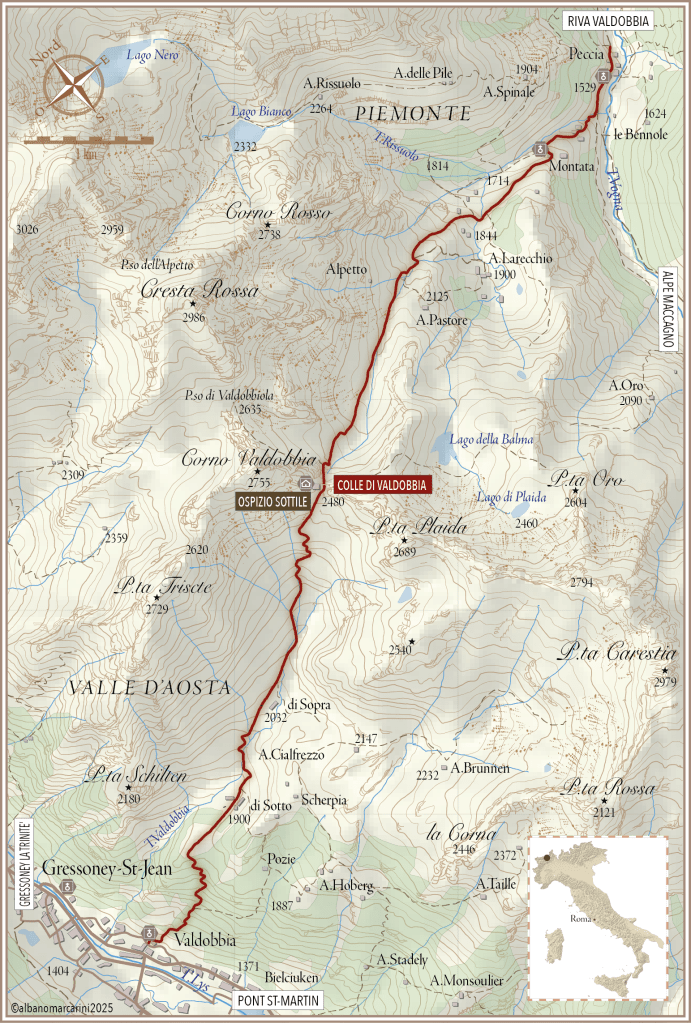 L’ardito tracciato risale i versanti montuosi e si apre la via in un varco del lungo contrafforte che dalla Piramide Vincent del Monte Rosa, in direzione da nord a sud, si dissolve nella Serra biellese. Per la sua collocazione, essendo pure allineato con i più occidentali Colle della Ranzola (alt. 2171) e Colle di Joux (alt. 1707), era ritenuto un tramite ideale con Aosta e i due valichi alpini del San Bernardo. Fino a tutto il Settecento l’itinerario del Colle di Valdobbia in Val d’Aosta era incluso fra i quattro maggiori per importanza, assieme alla Via d’Ivrea e ai colli del Grande e del Piccolo San Bernardo. Difatti, fin dall’inizio del XVI secolo, vi si indirizzavano i mercanti savoiardi diretti alla fiera annuale di Riva Valdobbia. Quando nel 1628 la Valle d’Aosta fu devastata dalla peste – si calcola che l’epidemia ridusse di quasi due terzi la sua popolazione – il morbo, inarrestabile e invisibile se non per i suoi letali effetti, prese pure questa via, spargendosi in Valsesia e, in primis, a Riva e fra i villaggi della Val Vogna toccati dalla mulattiera. Sciaguratamente era la dimostrazione di un’alta e continua frequentazione dove, ai mercanti, si aggiungevano gli emigranti, il cui flusso prese consistenza a partire dal XVI sec. I valsesiani, provetti nell’arte muraria, si recavano in Svizzera e nella Savoia con l’intenzione di rientrare nei luoghi d’origine ogni anno, all’inizio dell’inverno per ripartire qualche mese dopo prim’ancora dello sciogliersi delle nevi. Così le cronache rivelano, con toni cupi, l’impressionante numero di viandanti dispersi o periti sotto le valanghe, precipitati dal sentiero, assiderati dal freddo. Eppure non mancavano nelle località di partenza dell’una e dell’altra valle i segnacoli a cui invocare protezione per il cammino: a Riva Valdobbia era la maestosa figura di San Cristoforo, protettore dei viandanti, che campeggia sulla facciata della Parrocchiale; dal versante opposto, nella Valle del Lys, presso la Zoll Haus, erano ben sei le immagini sacre a cui il viandante poteva rivolgere implorante lo sguardo, pochi passi prima dell’inizio dell’ascesa.