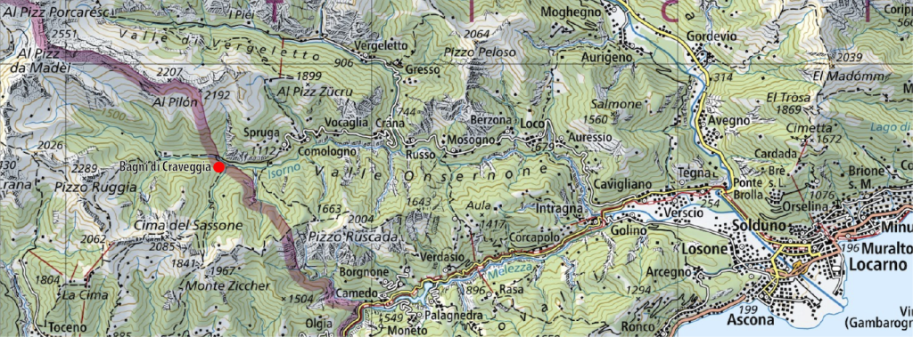 Ci sono valli che non sanno dove piantare le loro radici. Lo spazio è troppo angusto, non c’è posto per un fondovalle. Il torrente scava una forra e i due versanti, che mai vedono la luce del sole, s’incontrano quasi verticali. Così che i paesi devono aggrapparsi alle montagne per non essere trascinati giù e seppur si vedano l’uno con l’altro, quasi che ci si possa parlare a distanza, esistono fra di loro delle infossature di centinaia di metri che rendono i cammini sui sentieri molto penosi oltre che pericolosi. La Valle Onsernone, alle spalle di Locarno, nel Canton Ticino, è una valle lunga, aspra, tortuosa, senza radici. Quando ancora non vi era strada, per percorrerla a piedi occorrevano quasi 8 ore. I due terzi del suo sviluppo sono in Svizzera, il resto, ovvero la testata, sta in Italia. Dal nostro Paese si raggiunge in quattro ore di cammino oltrepassando montagne disabitate. Il motivo di questa anomalia politica si spiega giusto a causa dell’impervia orografia della valle. A paradosso era più agevole raggiungerla dall’italiana Val Vigezzo, così che gli alpigiani italiani, fin dal Medioevo, se ne impossessarono con le loro mandrie. In auto si arriva fino al confine, subito oltre il quale si trovano i Bagni di Craveggia, una decaduta fonte termale terapeutica, un tempo tanto apprezzata da attrarre clientela europea di alto rango. Distrutto da un incendio e poi travolto da una valanga, l’edificio dei bagni fu abbandonato. Di recente, grazie a una collaborazione fra i due Stati, una porzione è stata restaurata come monumento storico con il ripristino delle vasche d’acqua calda, liberamente accessibili.