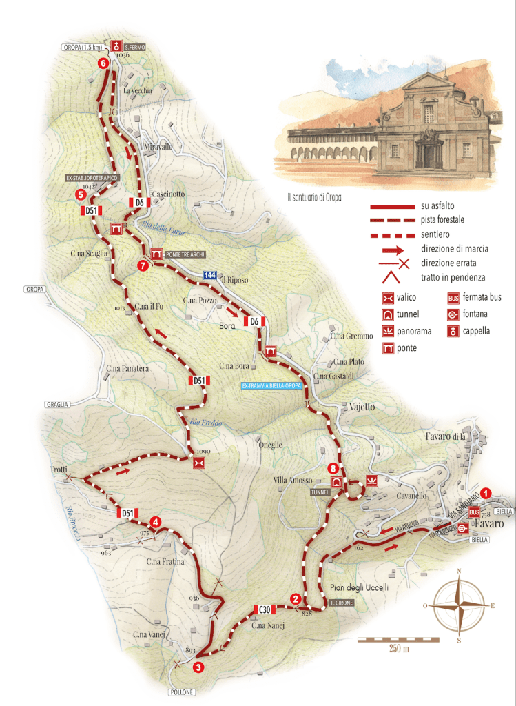 1. Il bus proveniente da Biella si arresta nell’abitato di Favaro (alt. 758), frazione di Cossila. Si continua a piedi lungo la via centrale (Via Santuario) fino al civico 561 dove si nota un cartello che segna l’inizio del percorso della tramvia: si piega a sinistra sulla stretta Via Sordevolo (fontana) che, poco dopo, sfocia su Via Arduzzi, la strada di circonvallazione diretta a Oropa (ex-statale 144); con prudenza la si segue verso destra per 300 metri, fino al primo tornante.